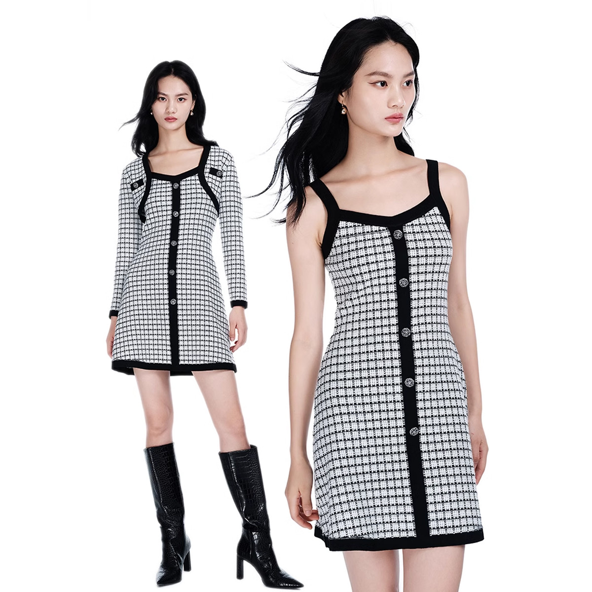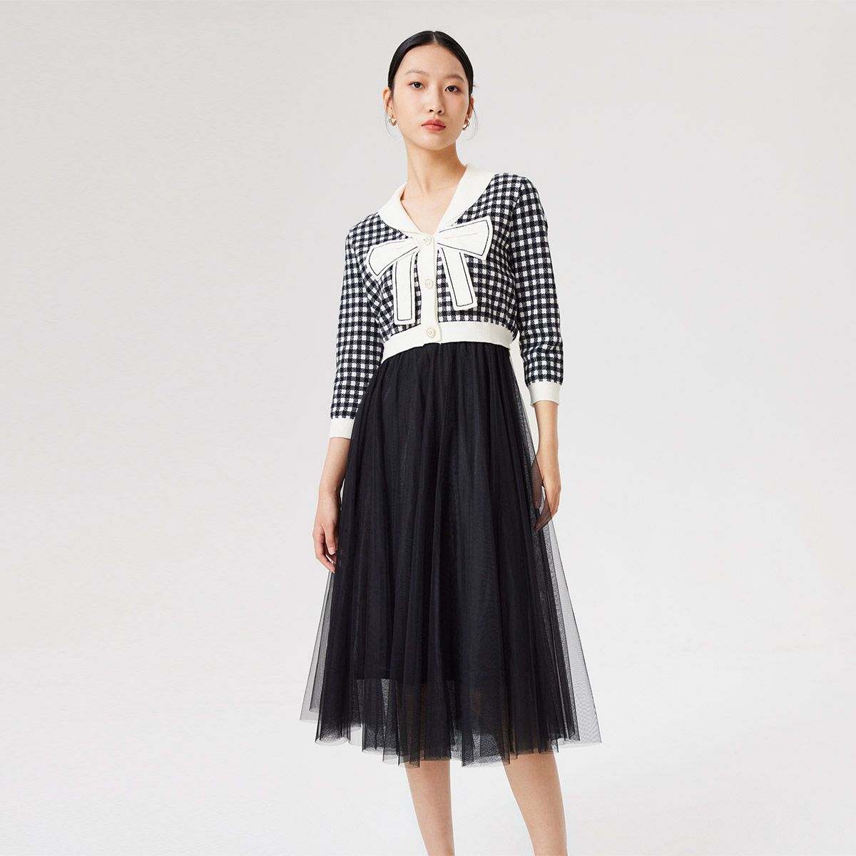 【两件套专柜同款】立体蝴蝶结减龄设计格纹针织连衣裙 999697