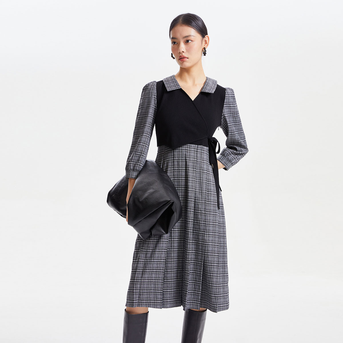 【春夏专柜款】格纹百褶长裙泡泡袖翻领复古简约连衣裙百搭时尚 942289