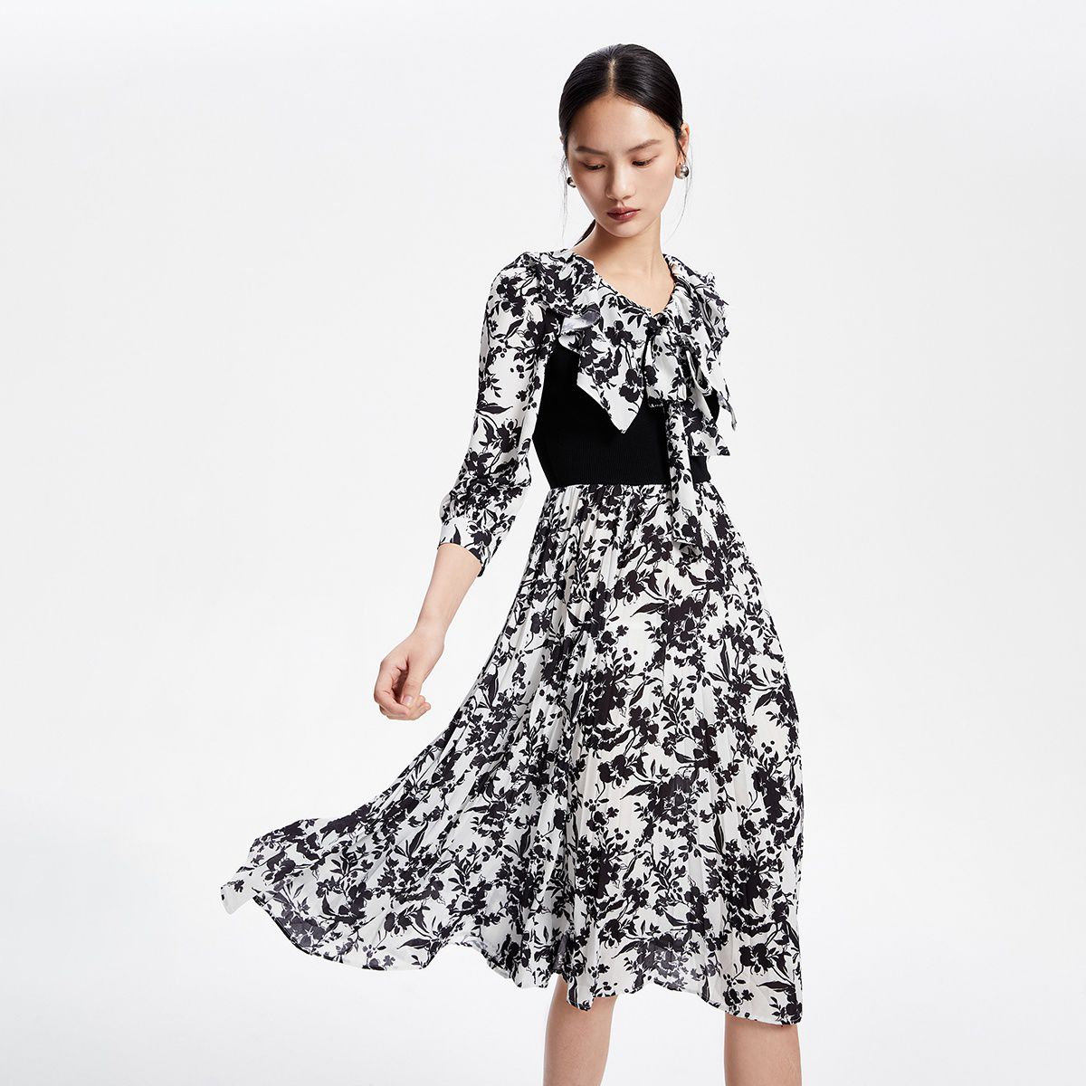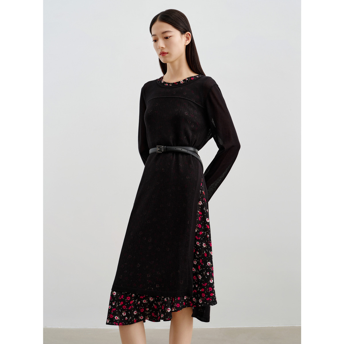 旗下安娜蔻系列雅致简约印花两件套开叉H型毛衫连衣裙女春季 226380