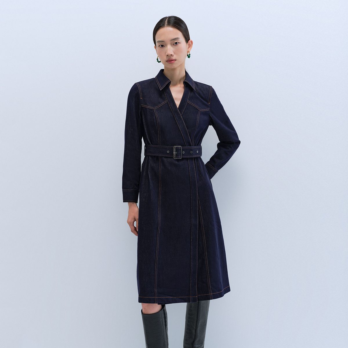 连衣裙休闲舒适含棉系带V领牛仔长裙女 838737