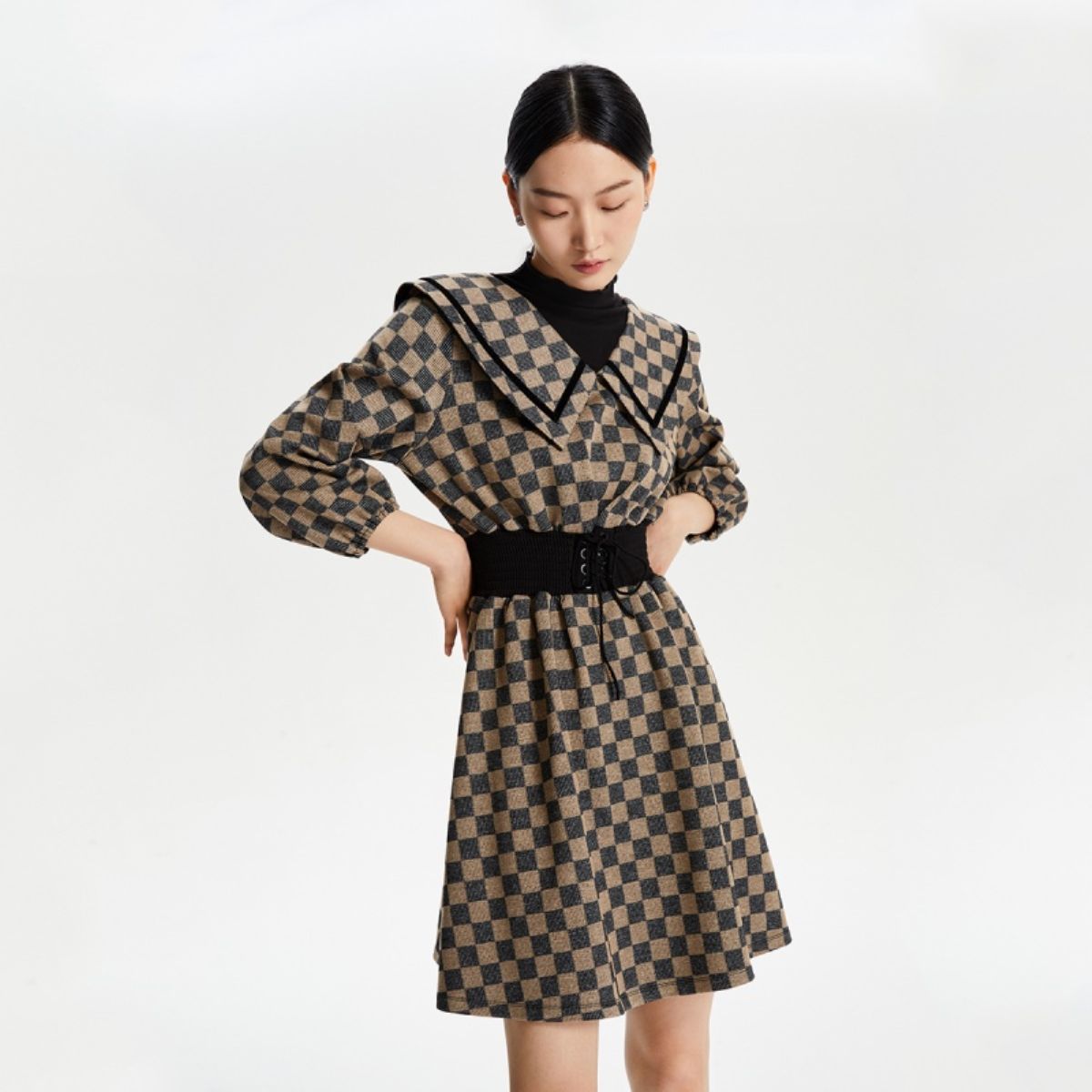 连衣裙收腰翻领格纹七分袖假两件休闲百搭 156881
