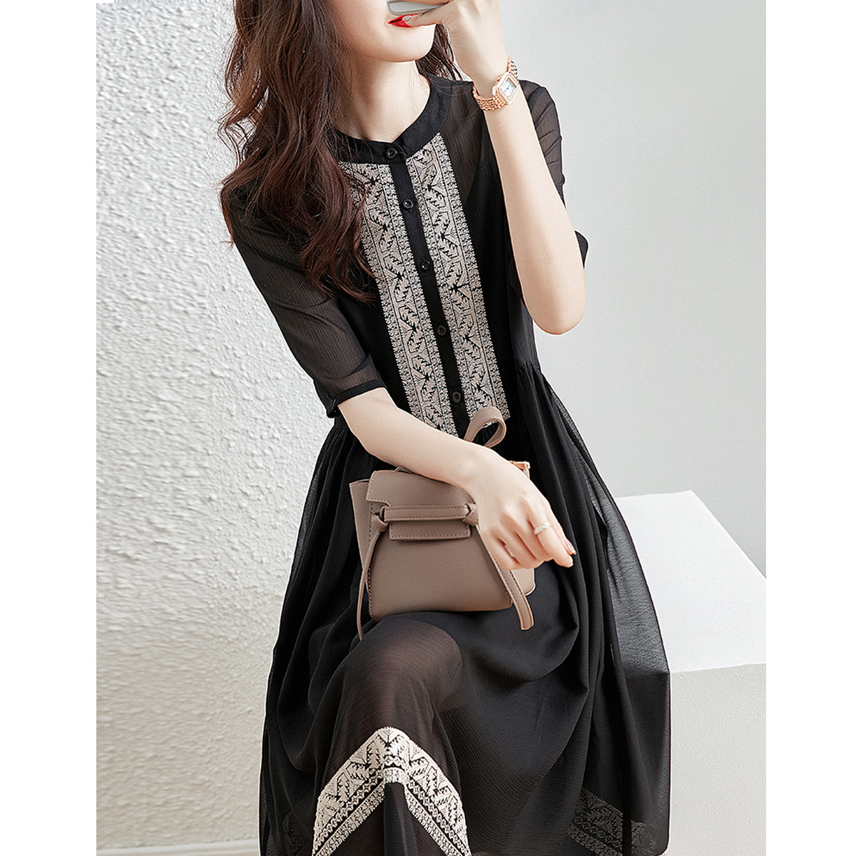 【超仙典雅雪纺绣花】秋季圆领刺绣连衣裙子女短袖中长款 351617