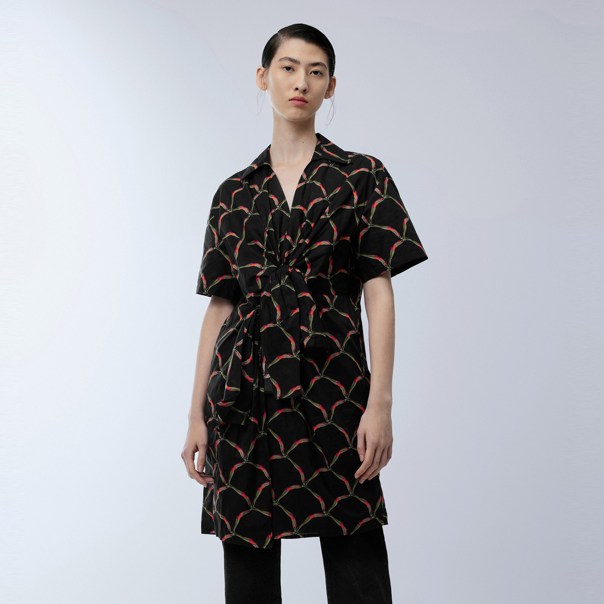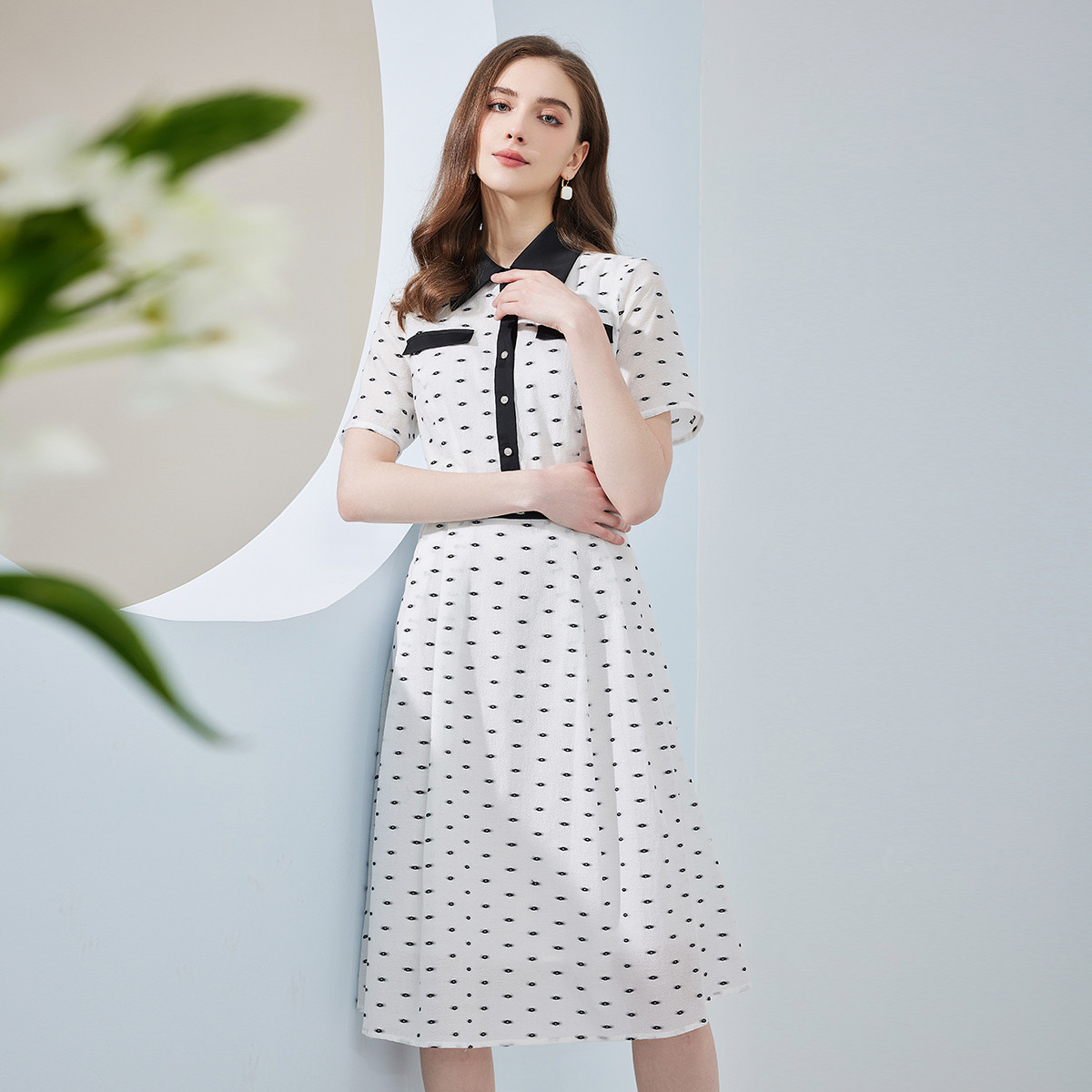 夏季小清新印花撞色经典衬衫领收腰连衣裙减龄洋气裙 576863