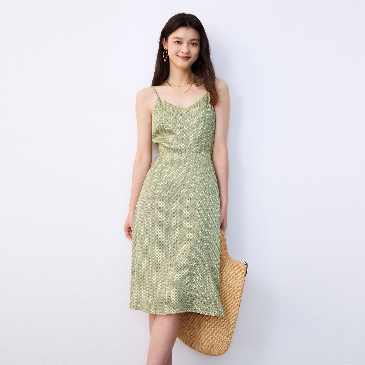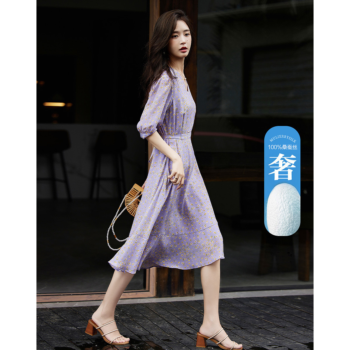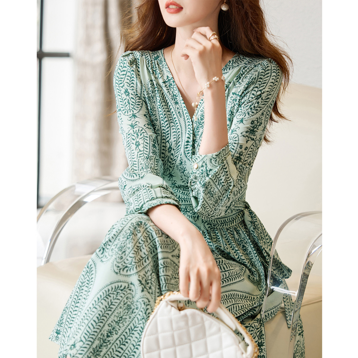 【真丝收藏家】春呼吸感桑蚕丝V领印花性感鱼尾连衣裙女 339329