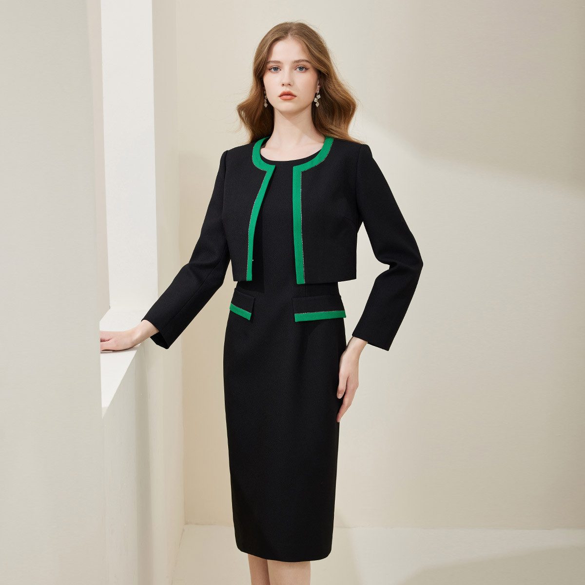 [商场同款]春秋款撞色修身圆领烫钻两件套外套+连衣裙 071647