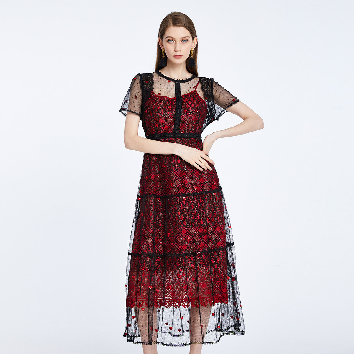春夏性感蕾丝绣亮片修身两件套式连衣裙 273823