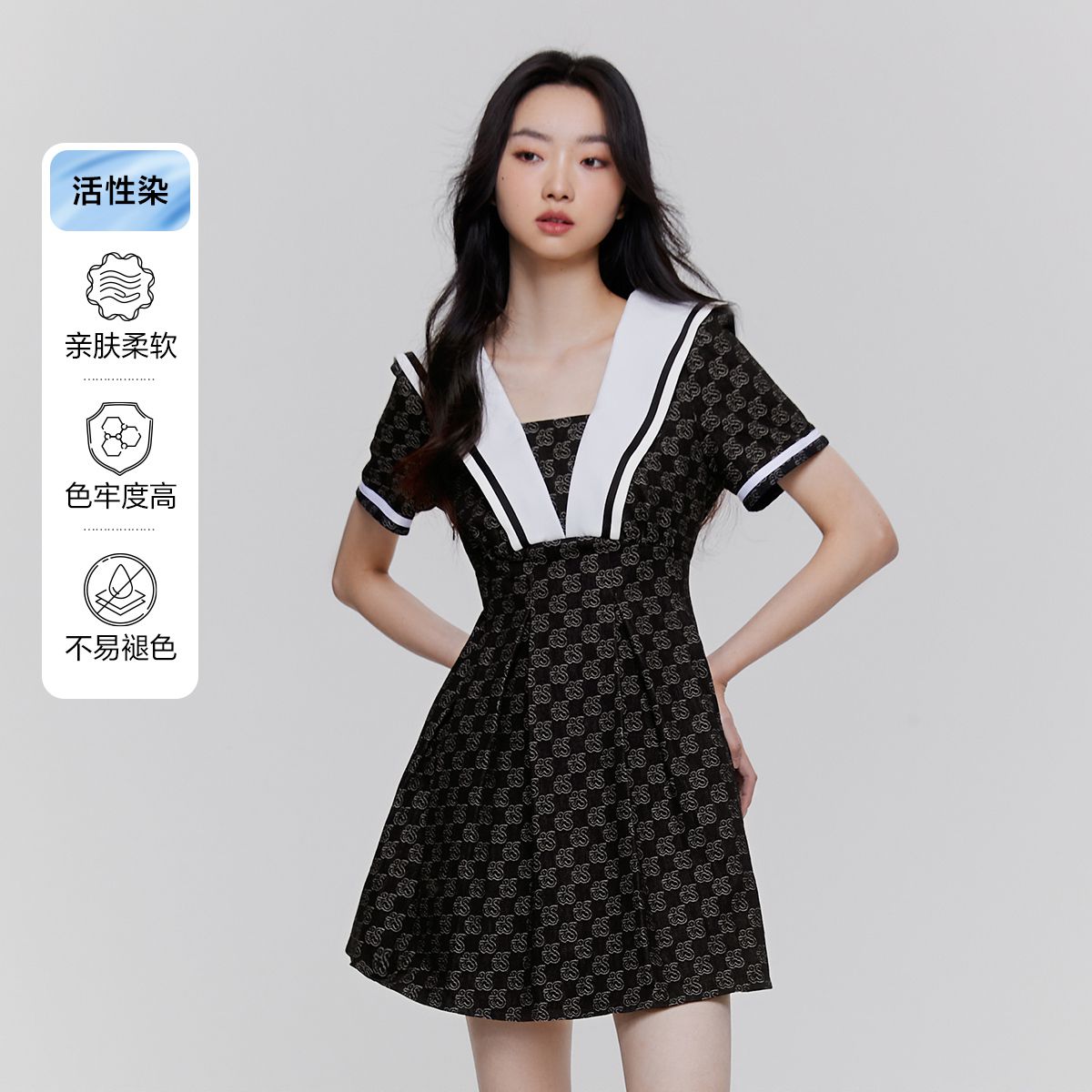 夏季撞色设计水手领活性染短款百褶牛仔连衣裙女 946266
