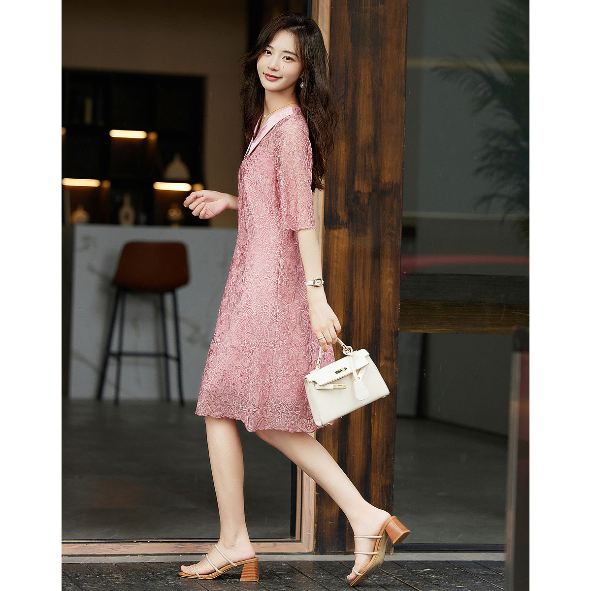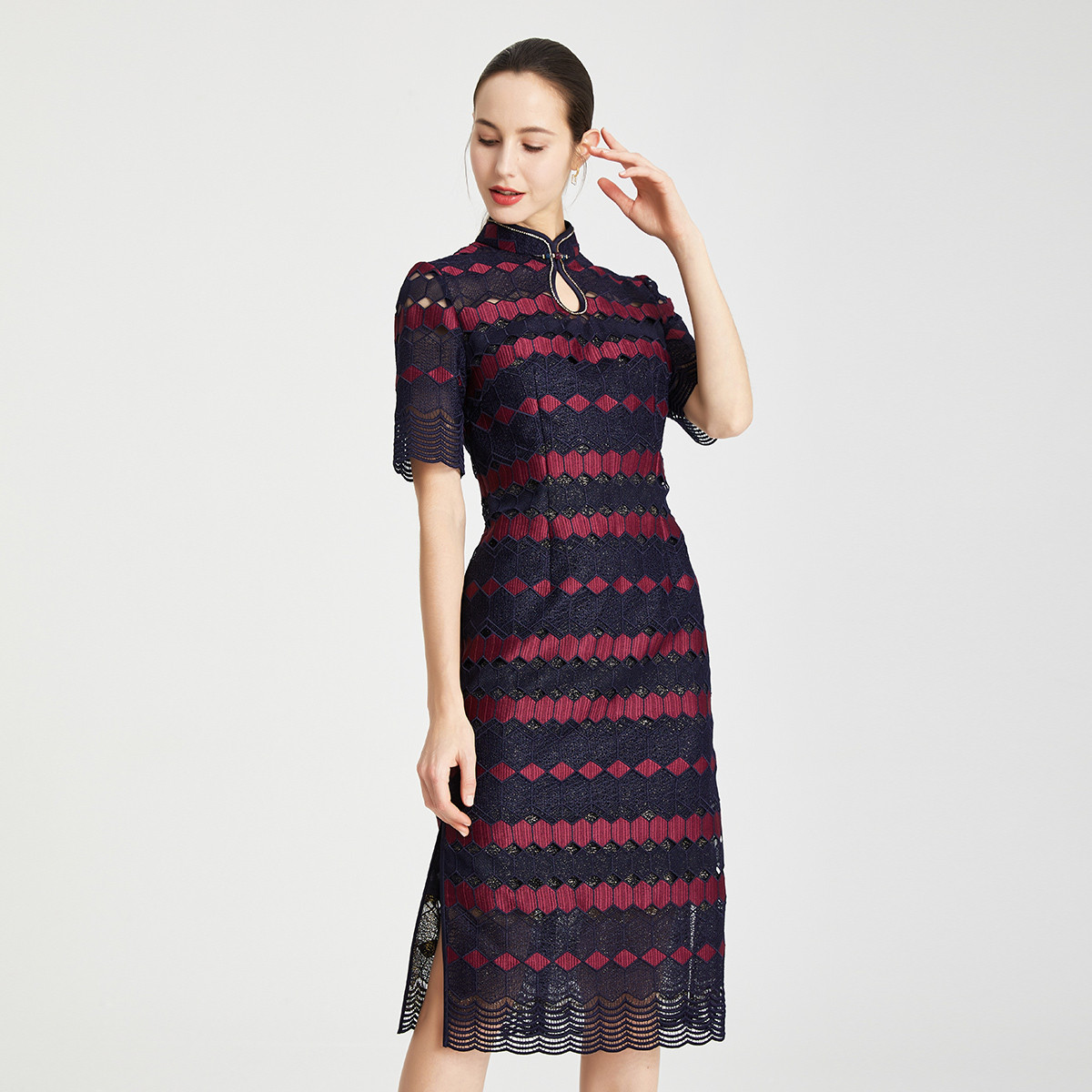 夏季立领蕾丝优雅旗袍式高级感连衣裙修身显瘦裙 155807
