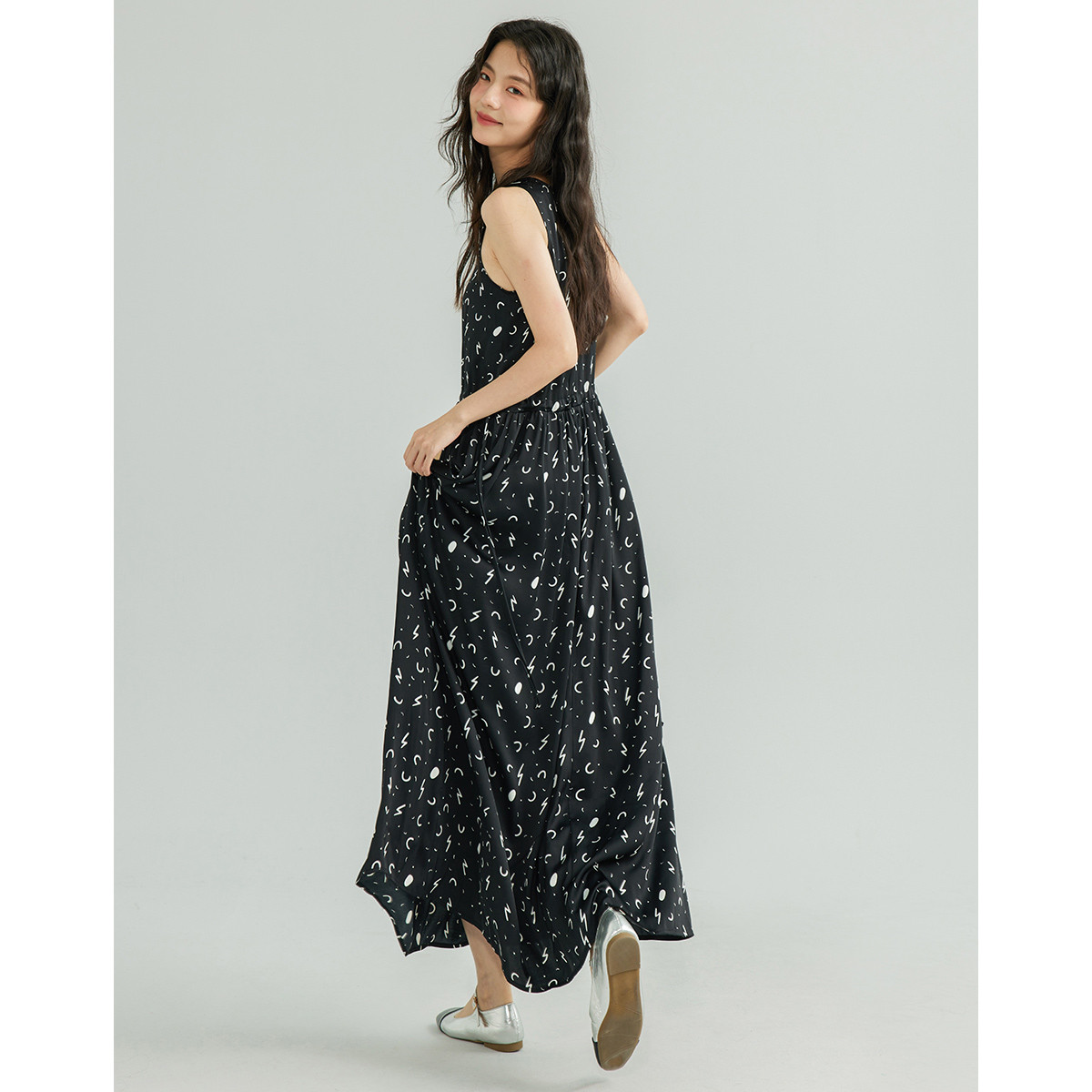 【轻奢度假】夏圆领桑蚕丝调节腰无袖抽绳印花复古连衣裙 620097