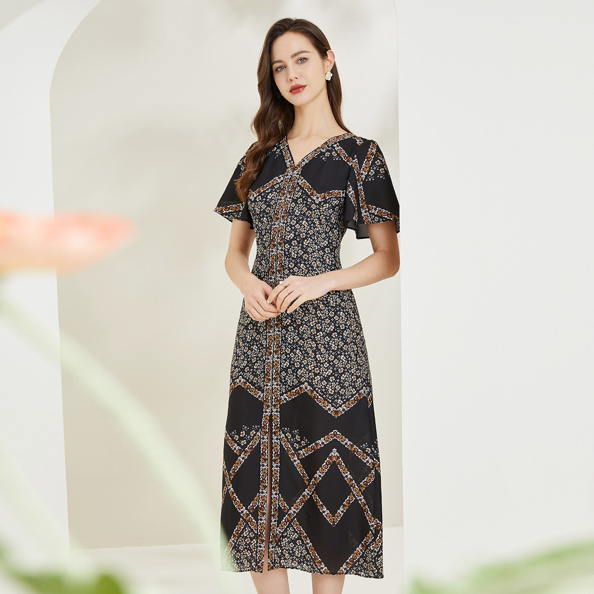 商场同款秋季古烂漫小碎花印花V领拼接色显瘦短袖连衣裙 048287