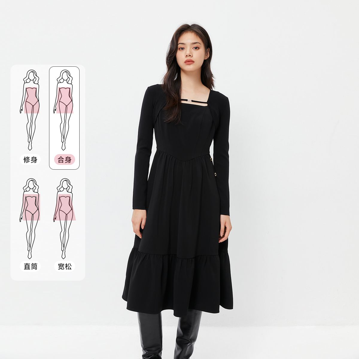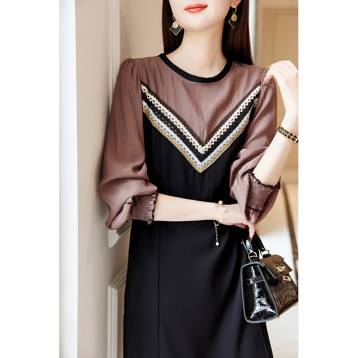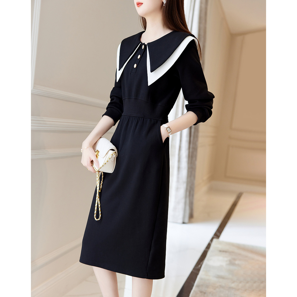 【大翻领撞色空气层一步裙】秋收腰连衣裙女中长款 530497