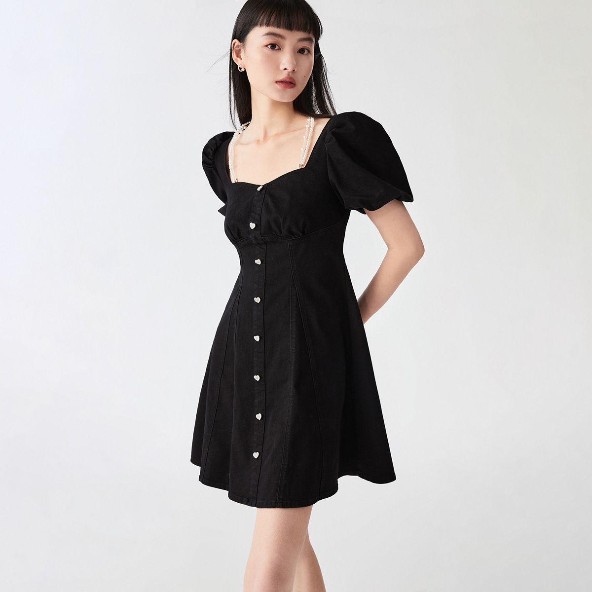 【专柜款夏】春夏方领泡泡袖收腰A字裙牛仔裙连衣裙气质百搭时尚 183185
