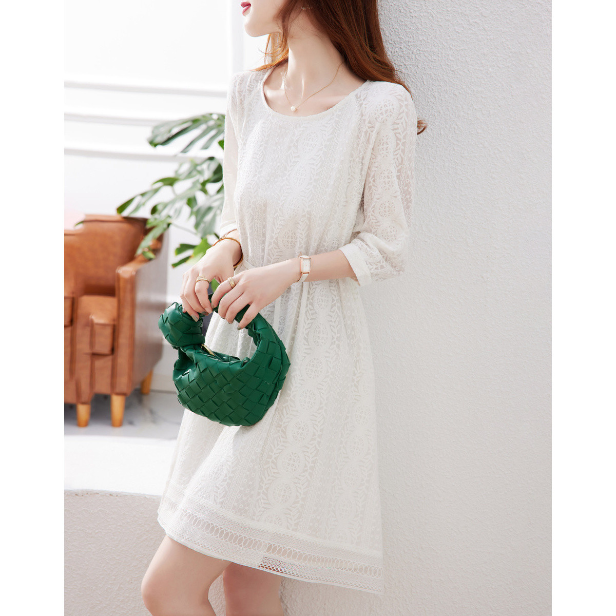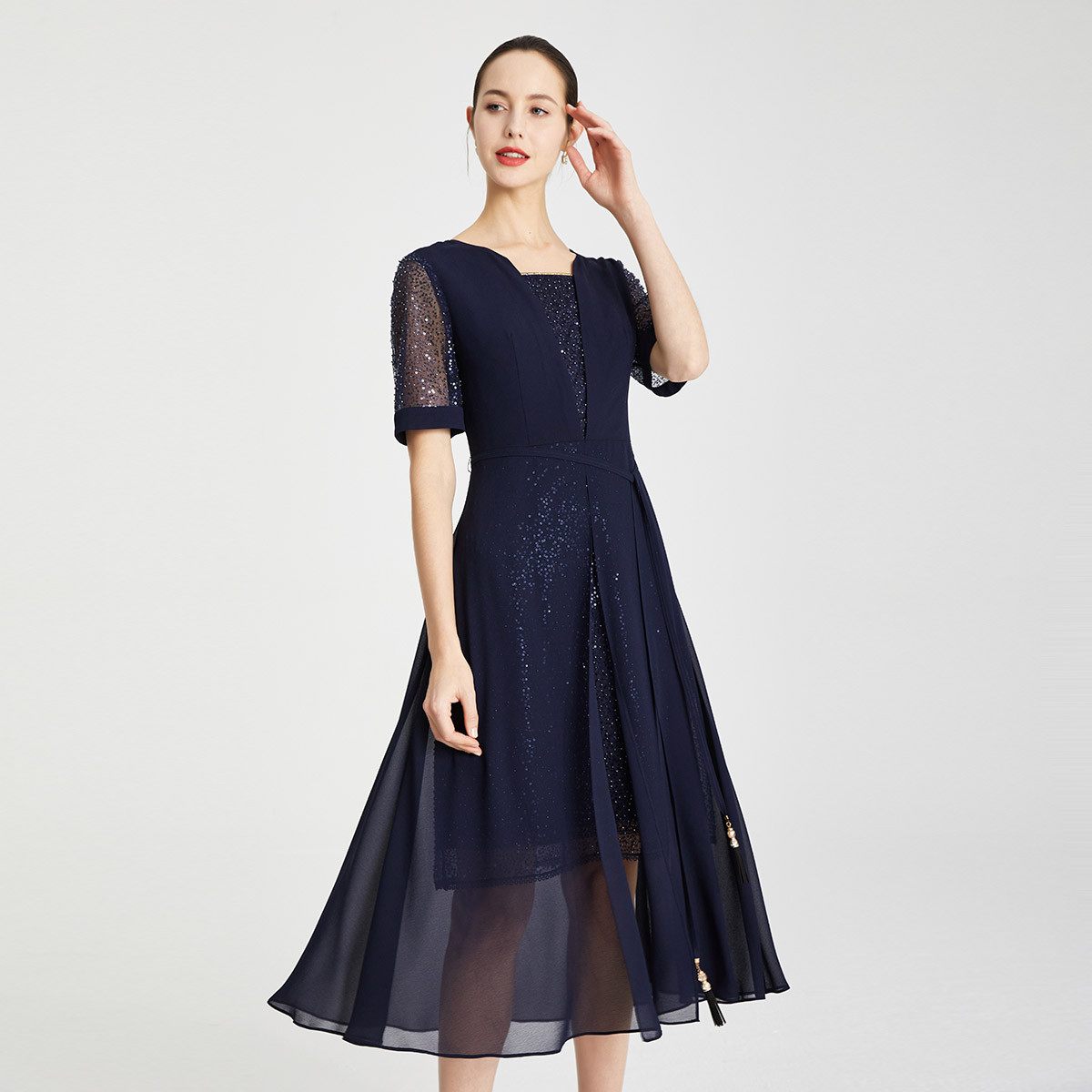 夏季温柔气质丝质时尚蕾丝相拼修身淑女中长款连衣裙 879839