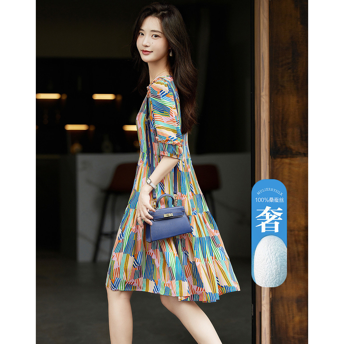 【雅奢桑蚕丝蛋糕裙】春秋圆领印花a字连衣裙女中长款 372097