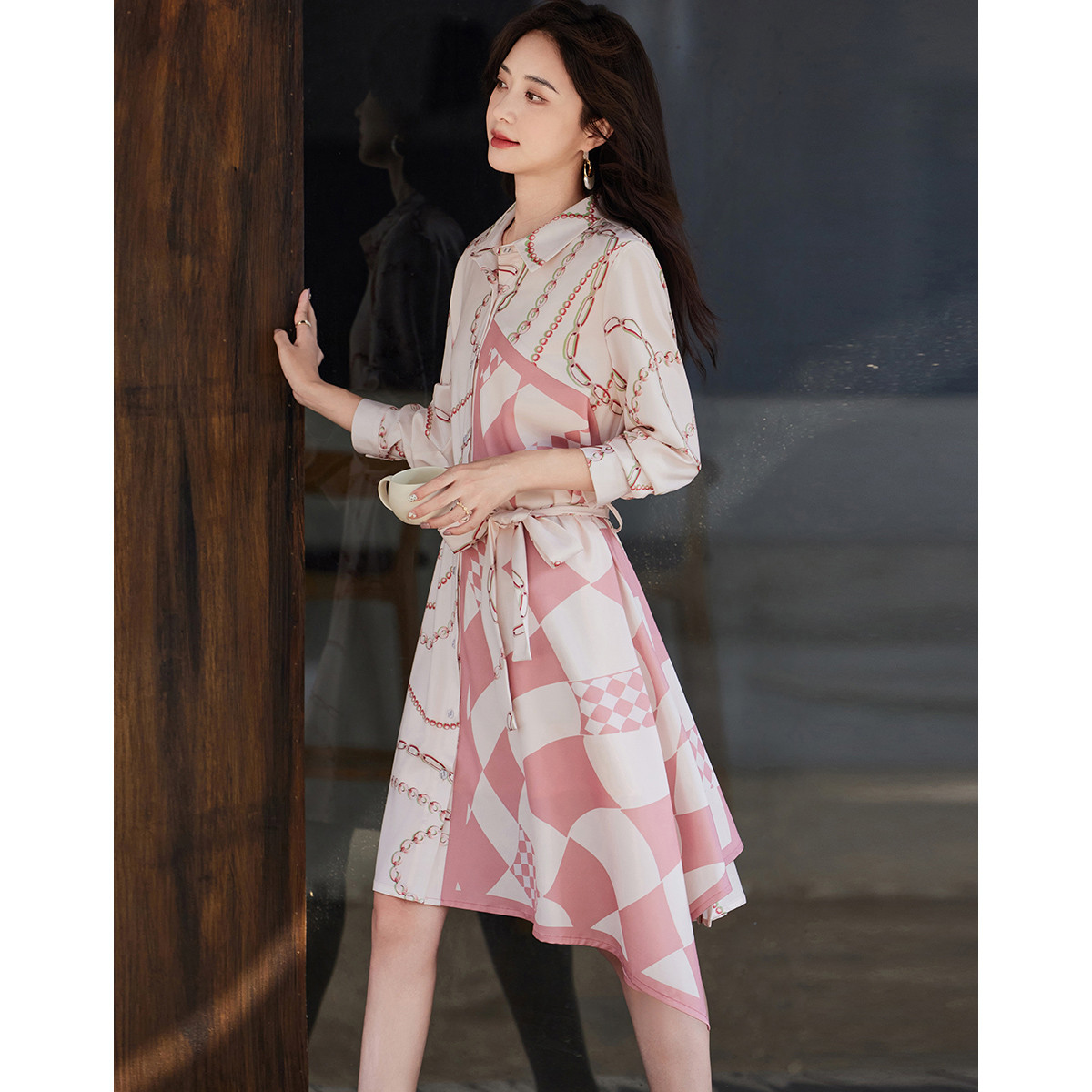 【轻盈雅致淑女】秋法式氛围翻领修身不规则衬衫式连衣裙女中长款 828673