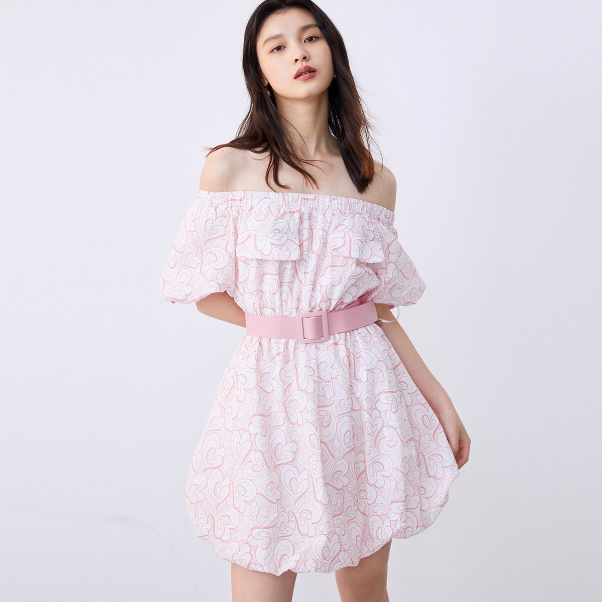 【蓬蓬裙】专柜可爱少女心形印花一字领连衣裙 524689