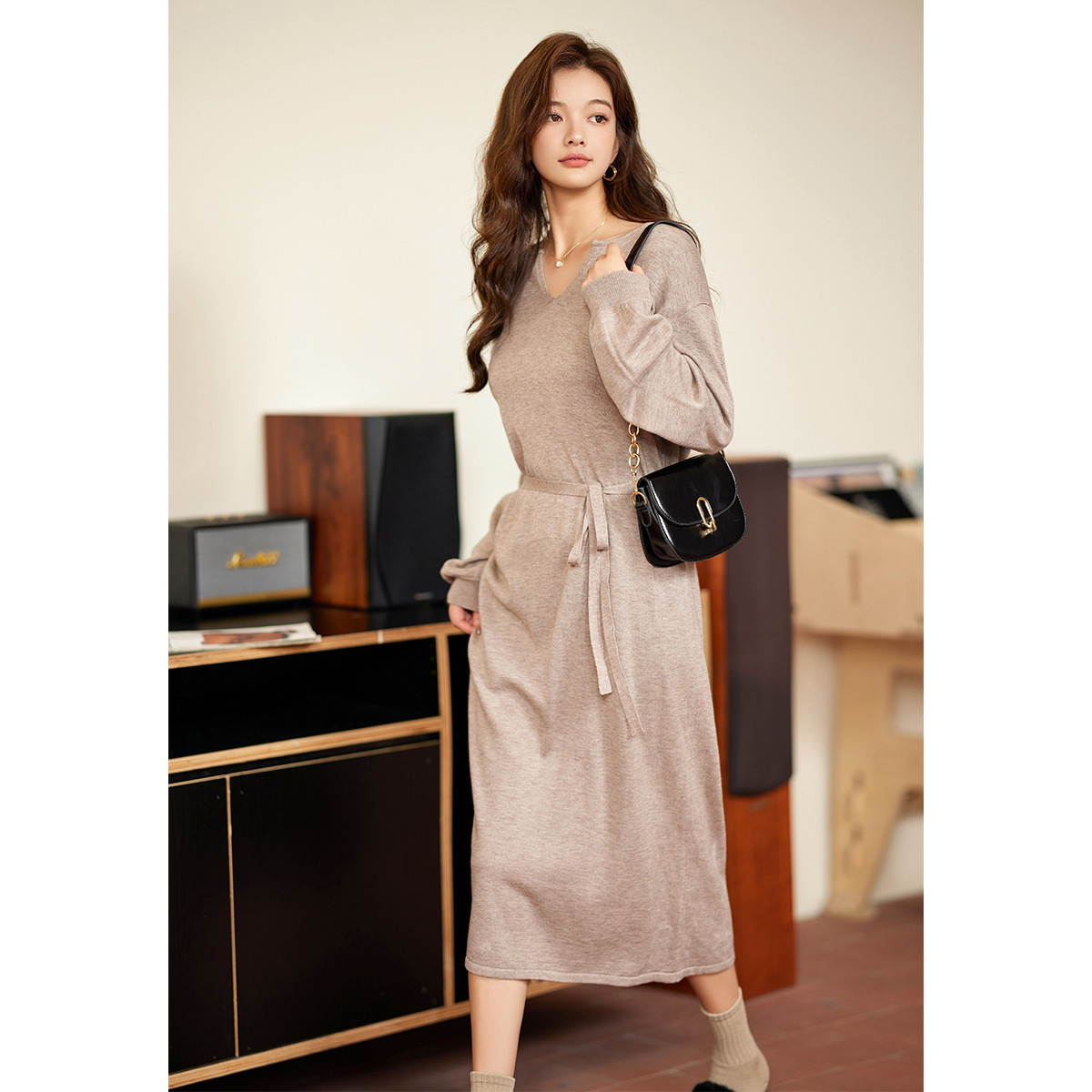 【浪漫巴黎】秋冬法式系带气质打底连衣裙高级长袖显瘦针织裙子女 422401