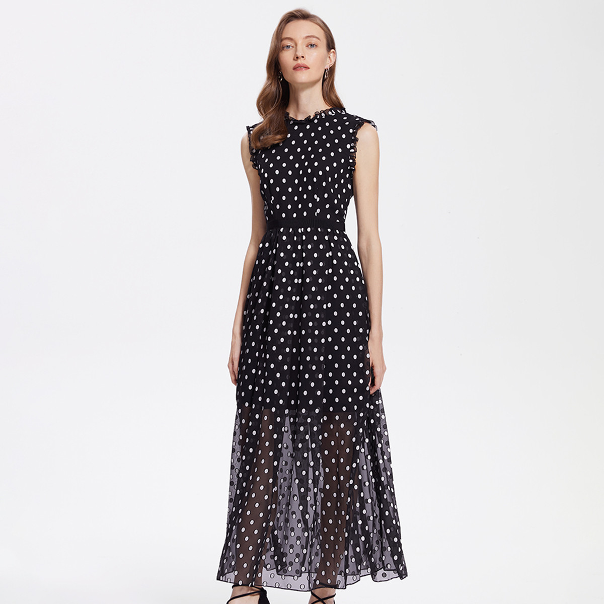 宝姿女装时尚气质雅致休闲日常波点无袖长连衣裙 779274