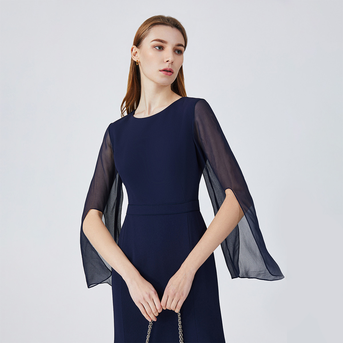 宝姿女装镂空袖设计圆领气质中长连衣裙 884042