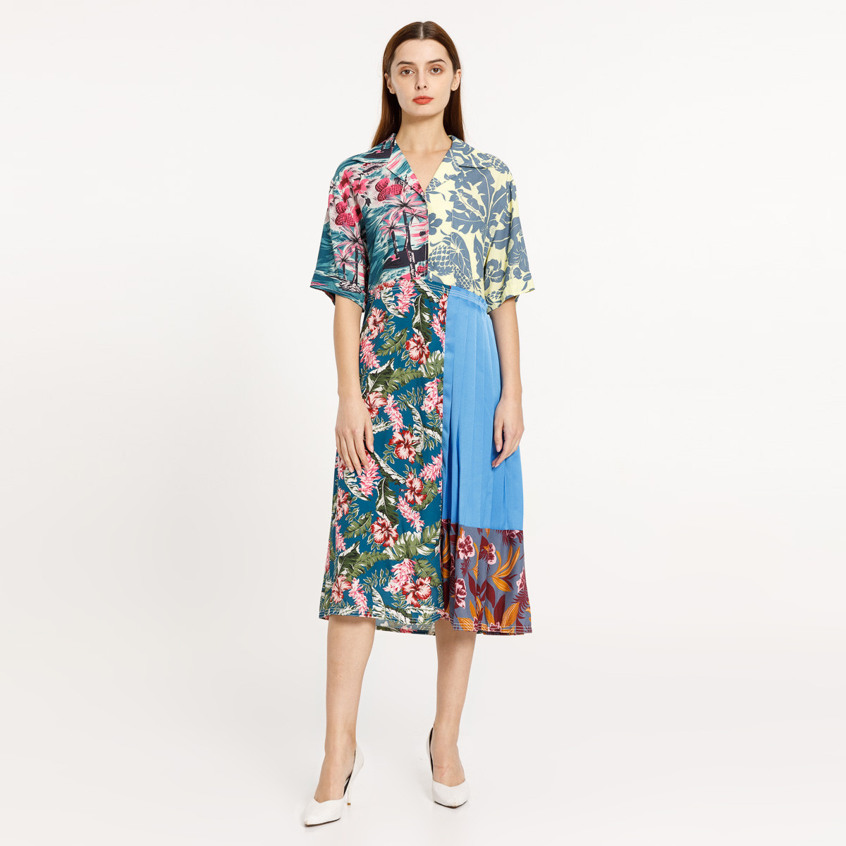 夏装v领褶皱荷叶边连衣裙女假两件气质显瘦短裙 979220