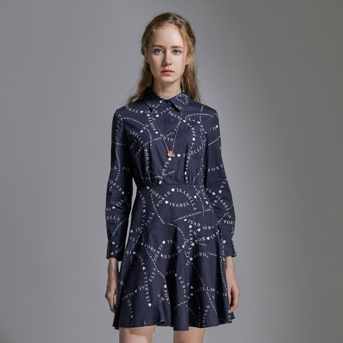 宝姿女装时尚满印LOGO日常通勤休闲百搭修身长袖中长连衣裙 803210