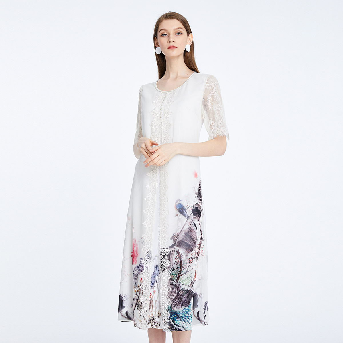 夏季温柔气质丝质时尚蕾丝相拼修身淑女中长款连衣裙 879839