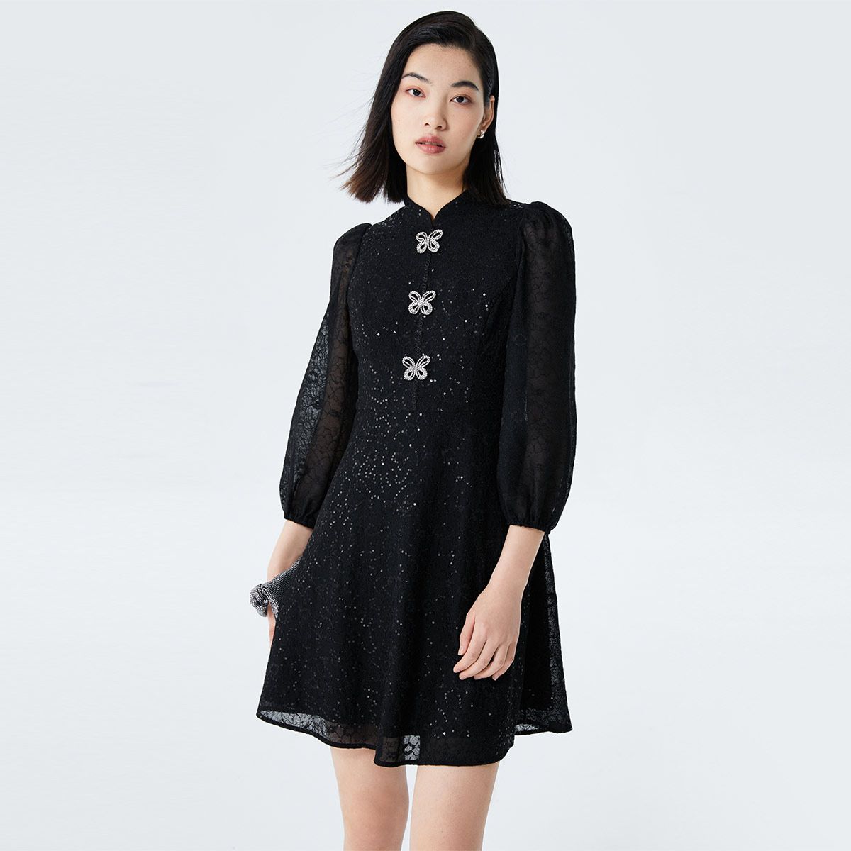 【新中式立领】春夏专柜同款七分泡泡袖蕾丝连衣裙气质百搭时尚 252433