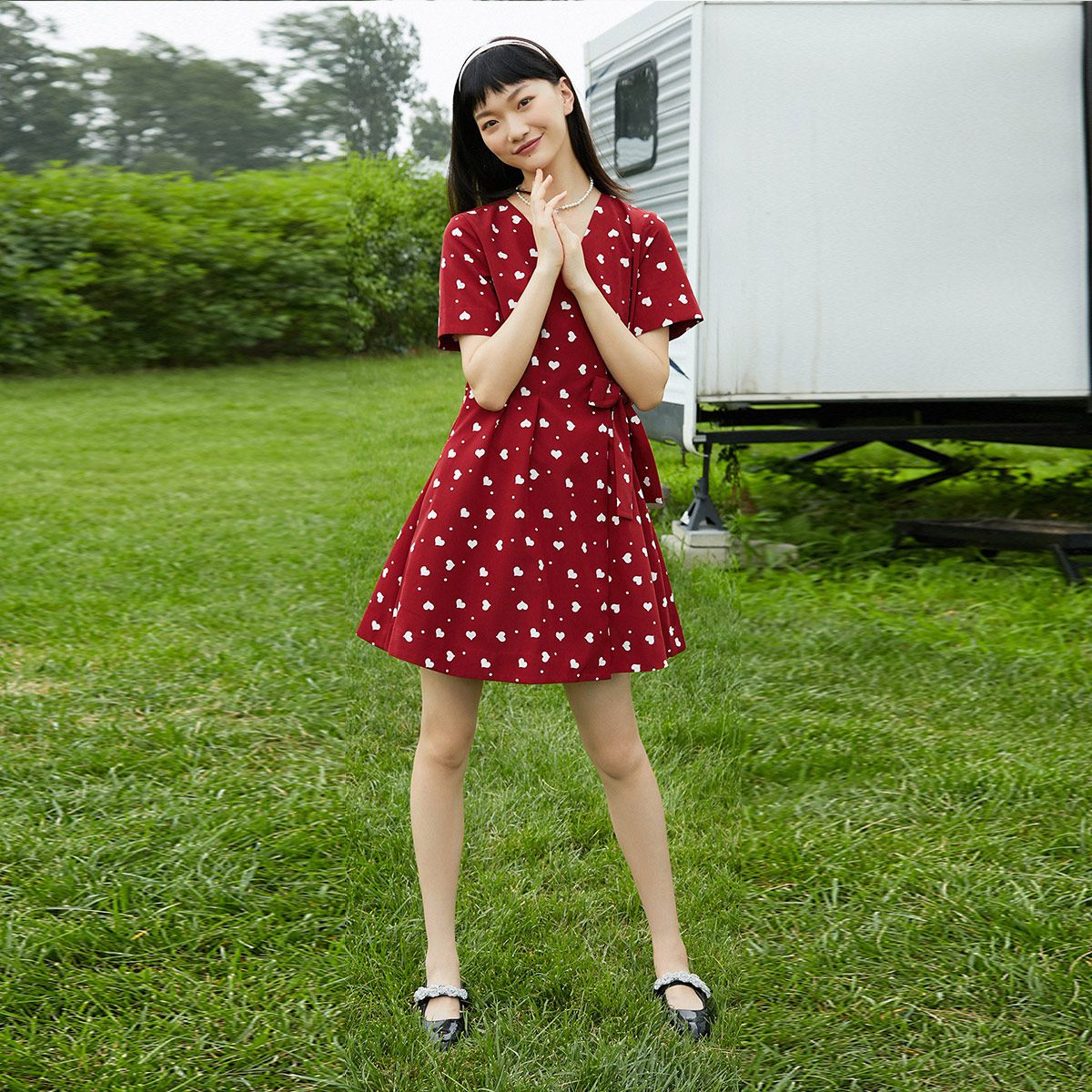 碎花复古风设计感不规则下摆V领短袖荷叶边显瘦收腰连衣裙女 368707