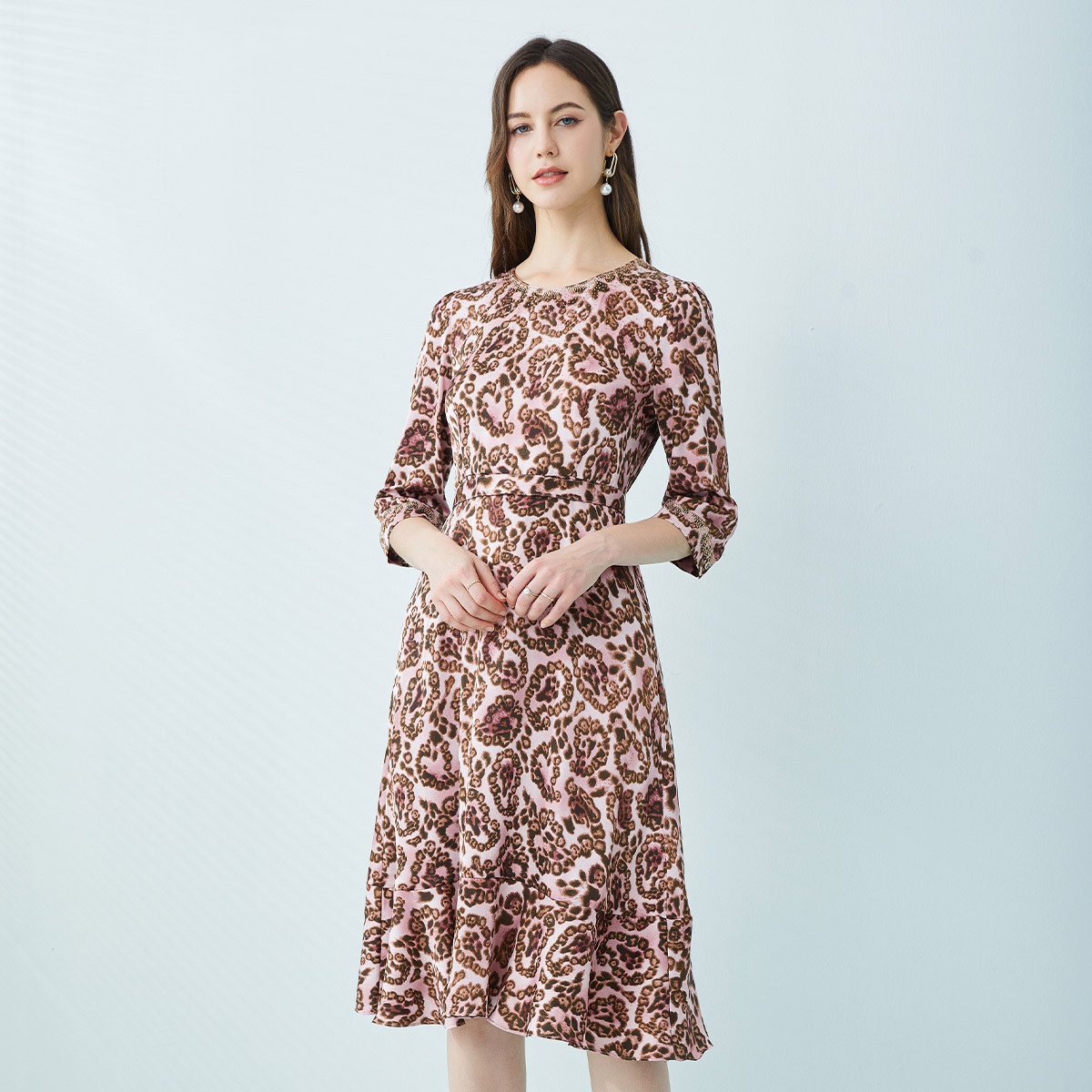 商场同款秋季时尚性感豹纹印花收腰七分袖连衣裙 630111
