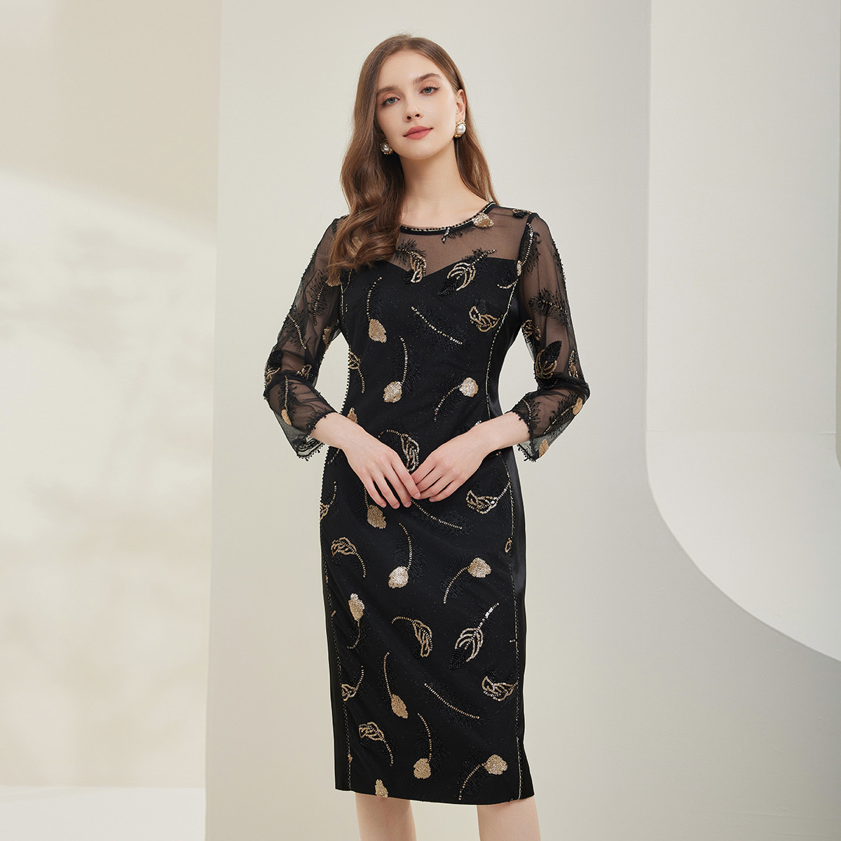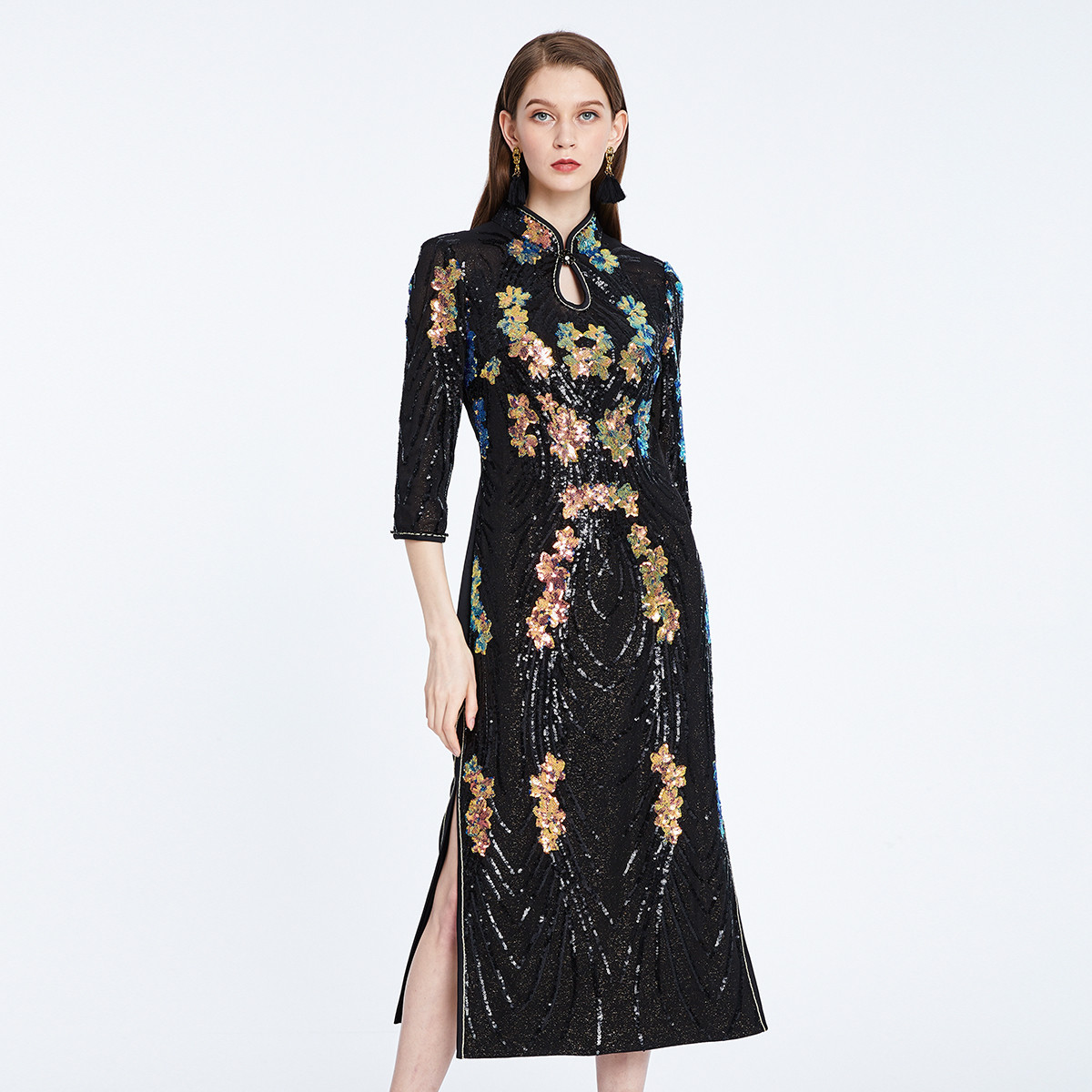 春季奢华珠片绣下摆开叉修身显瘦连衣裙 866015