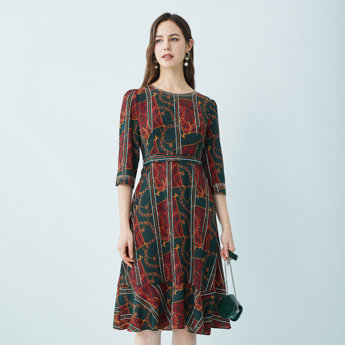 商场同款春季复古彩色波点精致烫钻V领系腰带连衣裙 914527