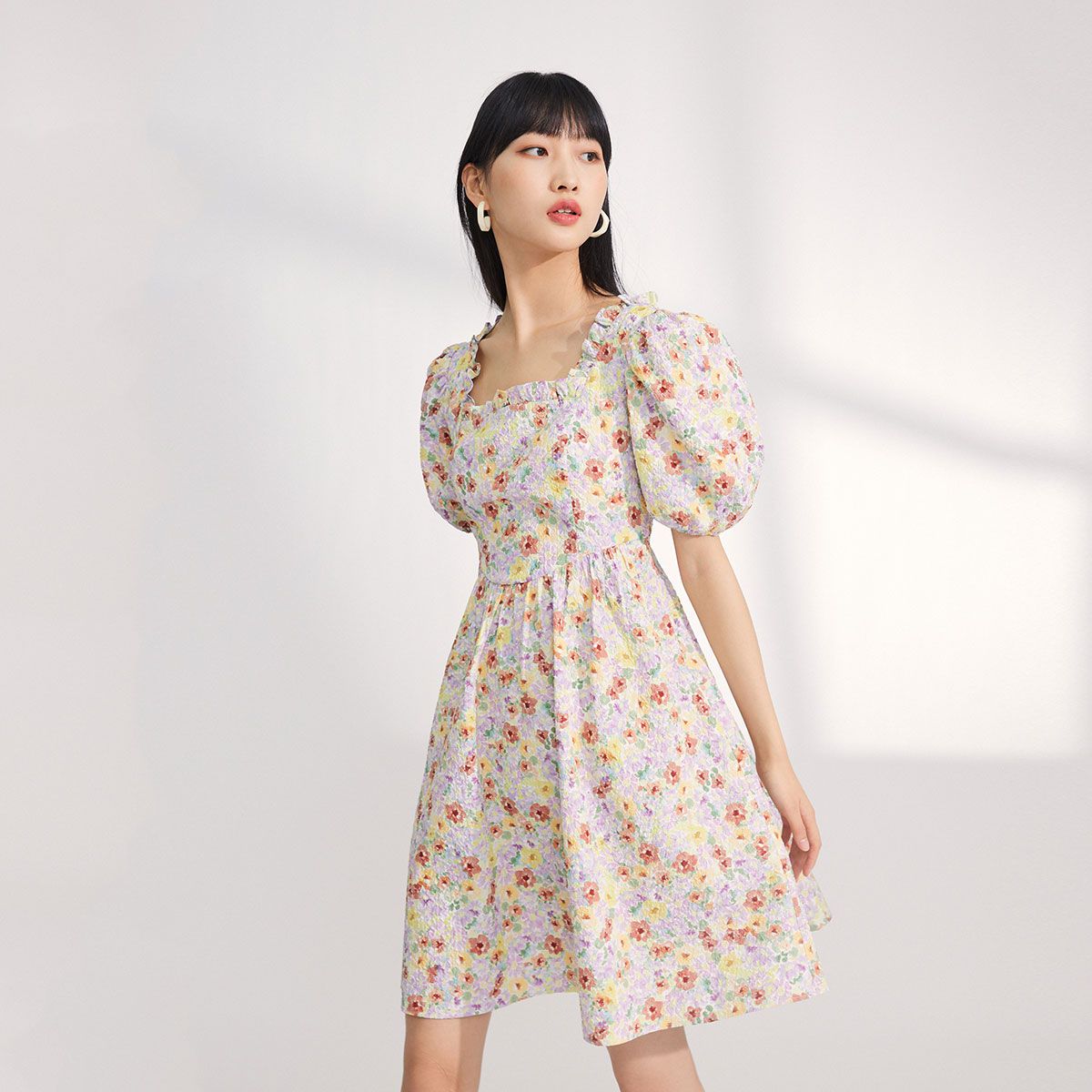 【油画碎花】方领泡泡袖修身连衣裙 059345