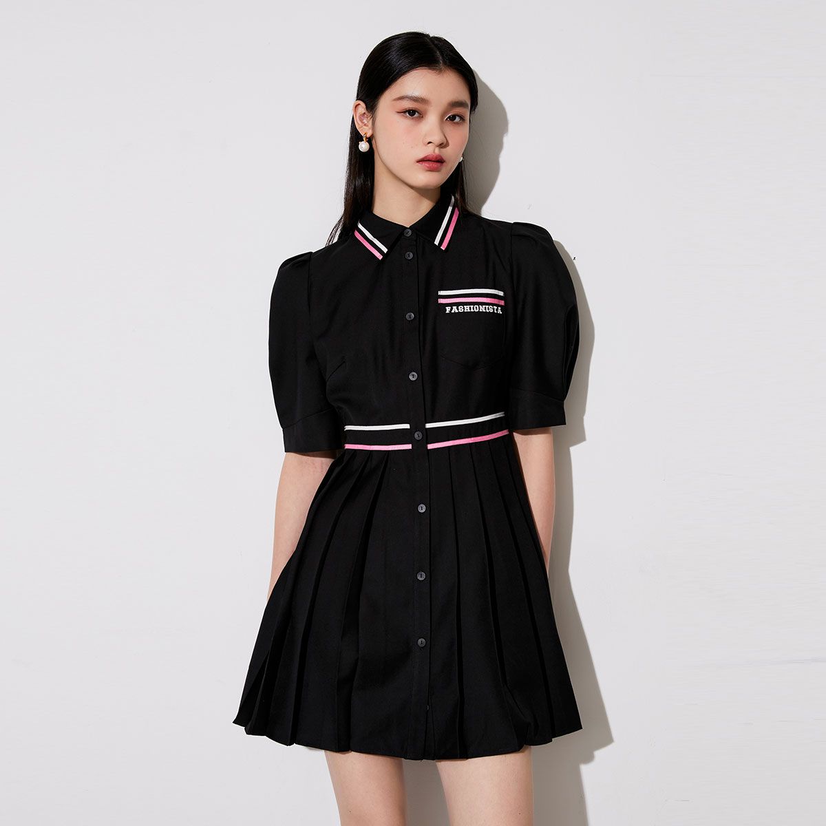 【减龄学院风】春夏专柜款短裙百褶泡泡五分袖翻领连衣裙百搭时尚 042769