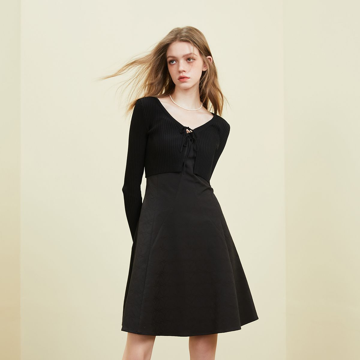 【春秋专柜款】吊带纯色A字收腰七分袖针织衫连衣裙女 983121