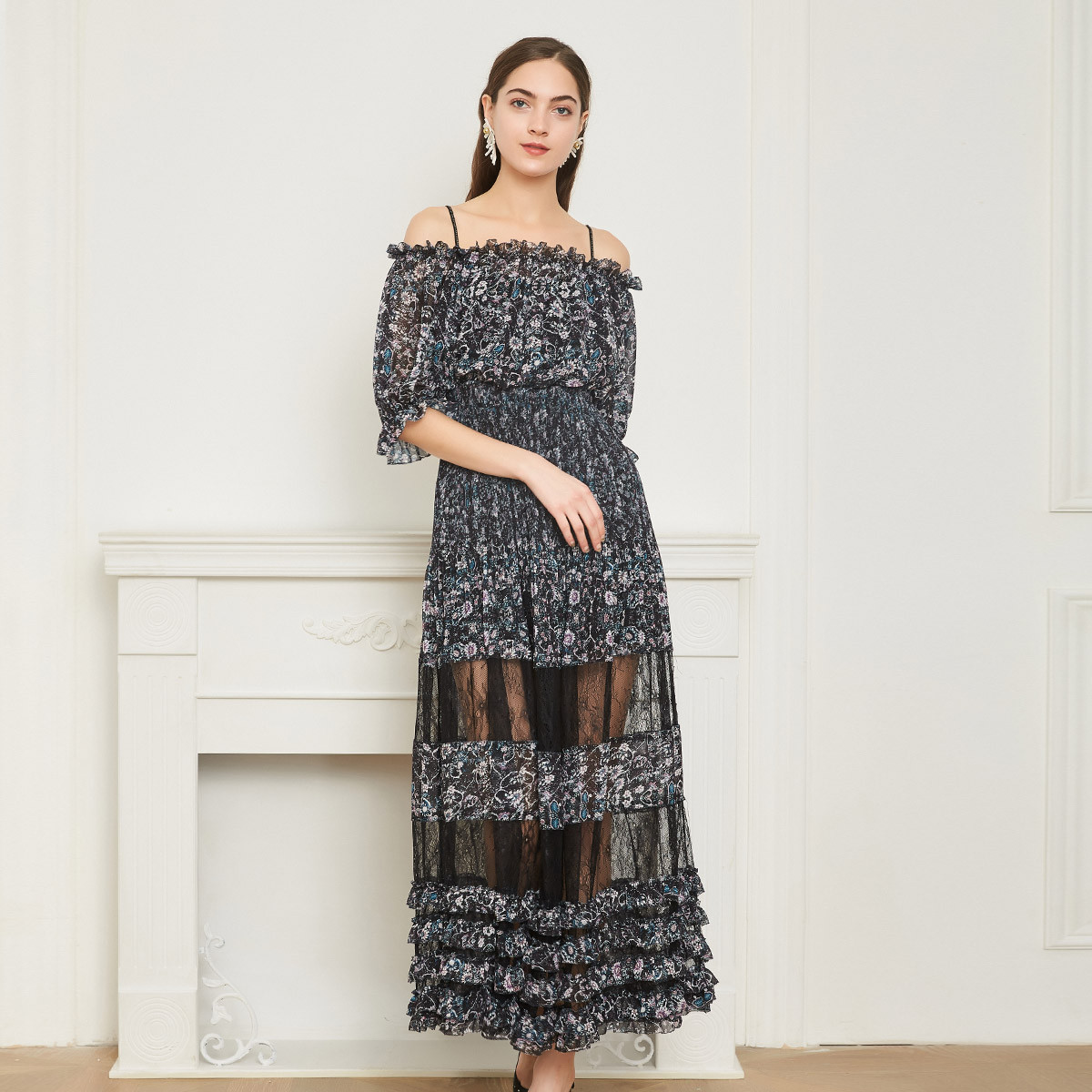商场同款一字肩碎花长款松紧腰短袖连衣裙 219615