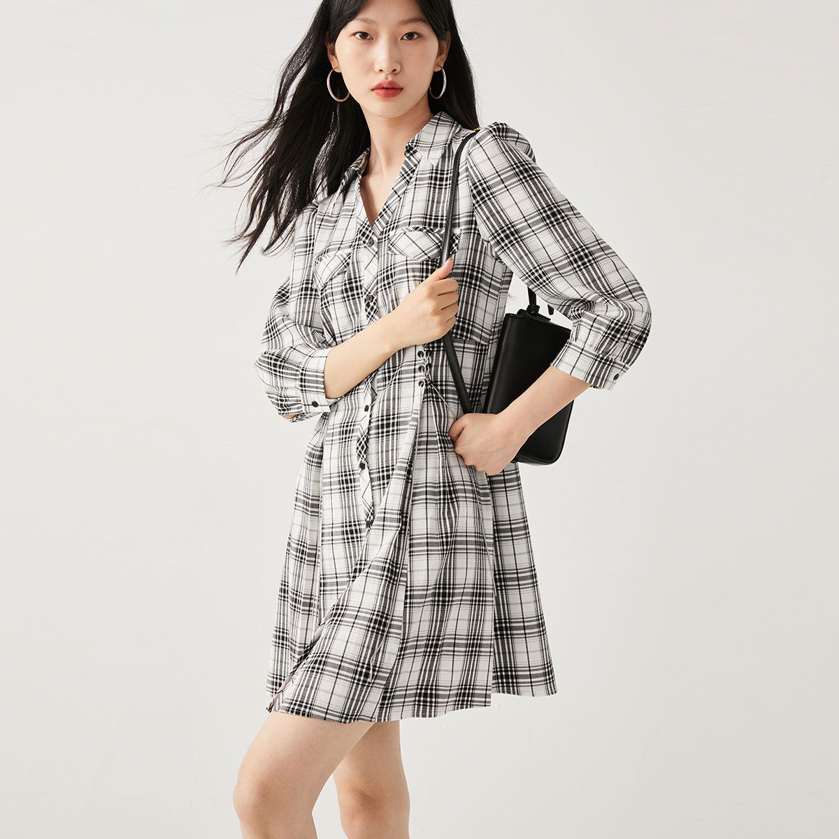 【春秋专柜款】复古格纹七分袖收腰A字裙短裙连衣裙 600785