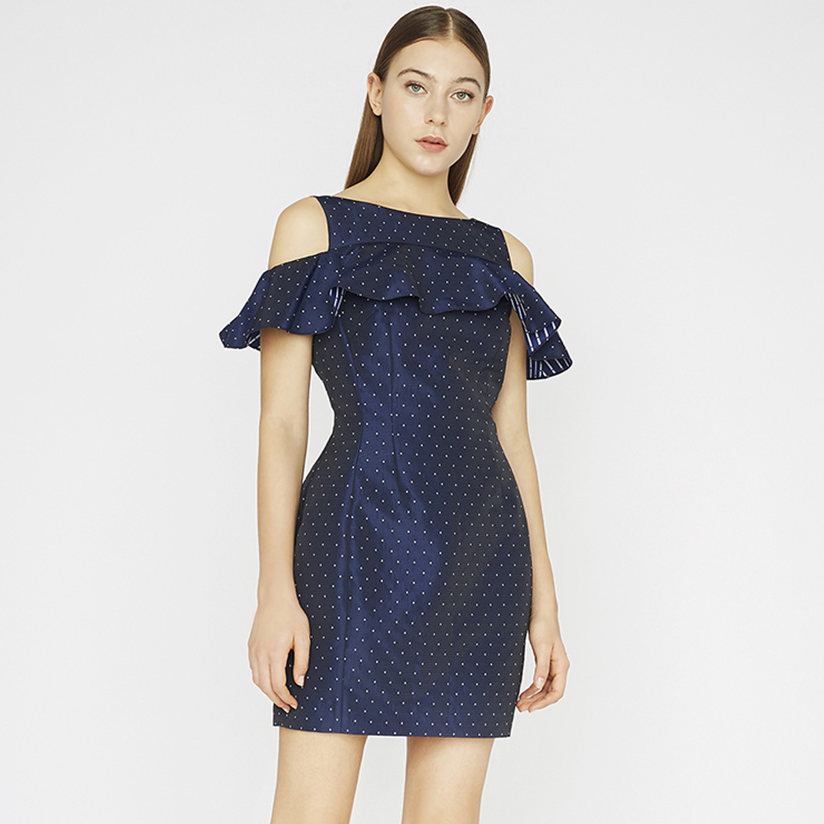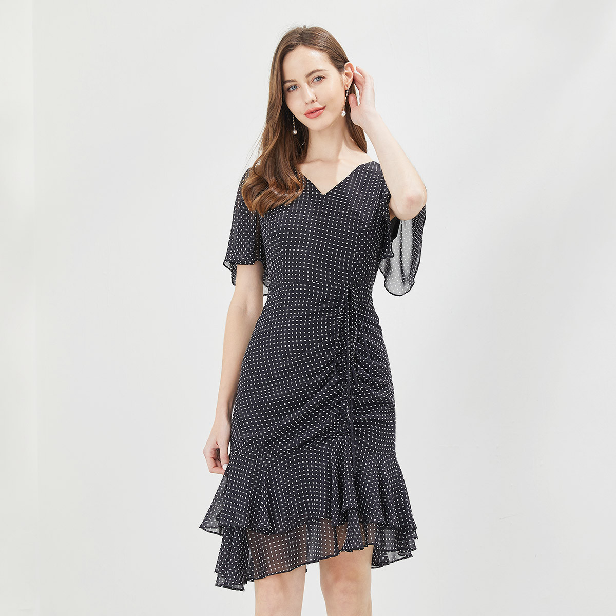 夏装V领抽皱荷叶边波点修身连衣裙 608479