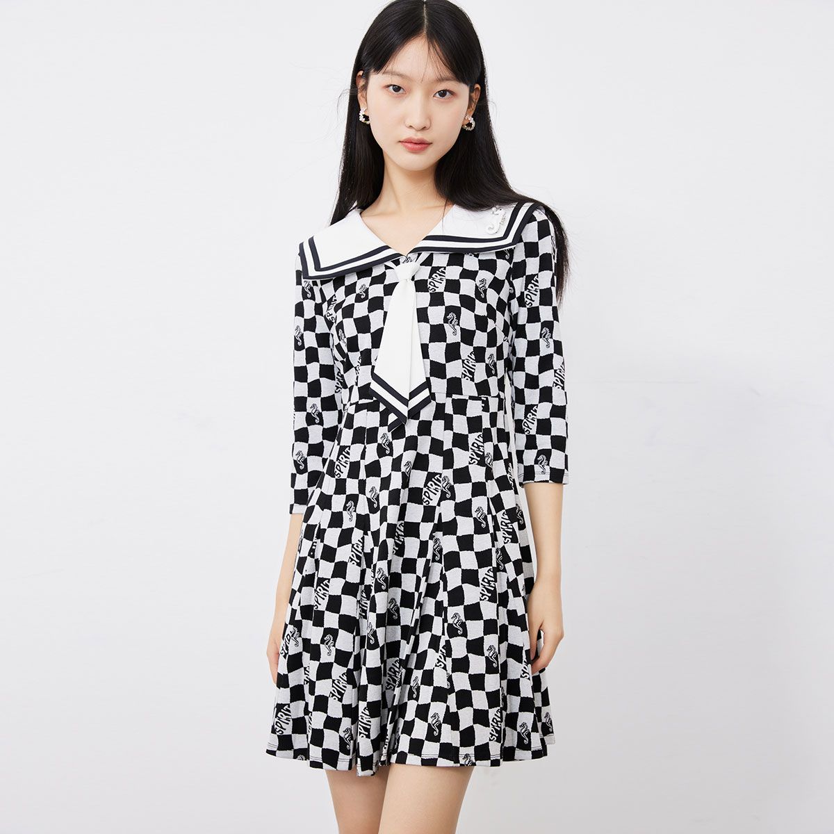 【海军风甜美减龄】春夏棋盘格可拆卸胸针领带装饰连衣裙百搭时尚 507793