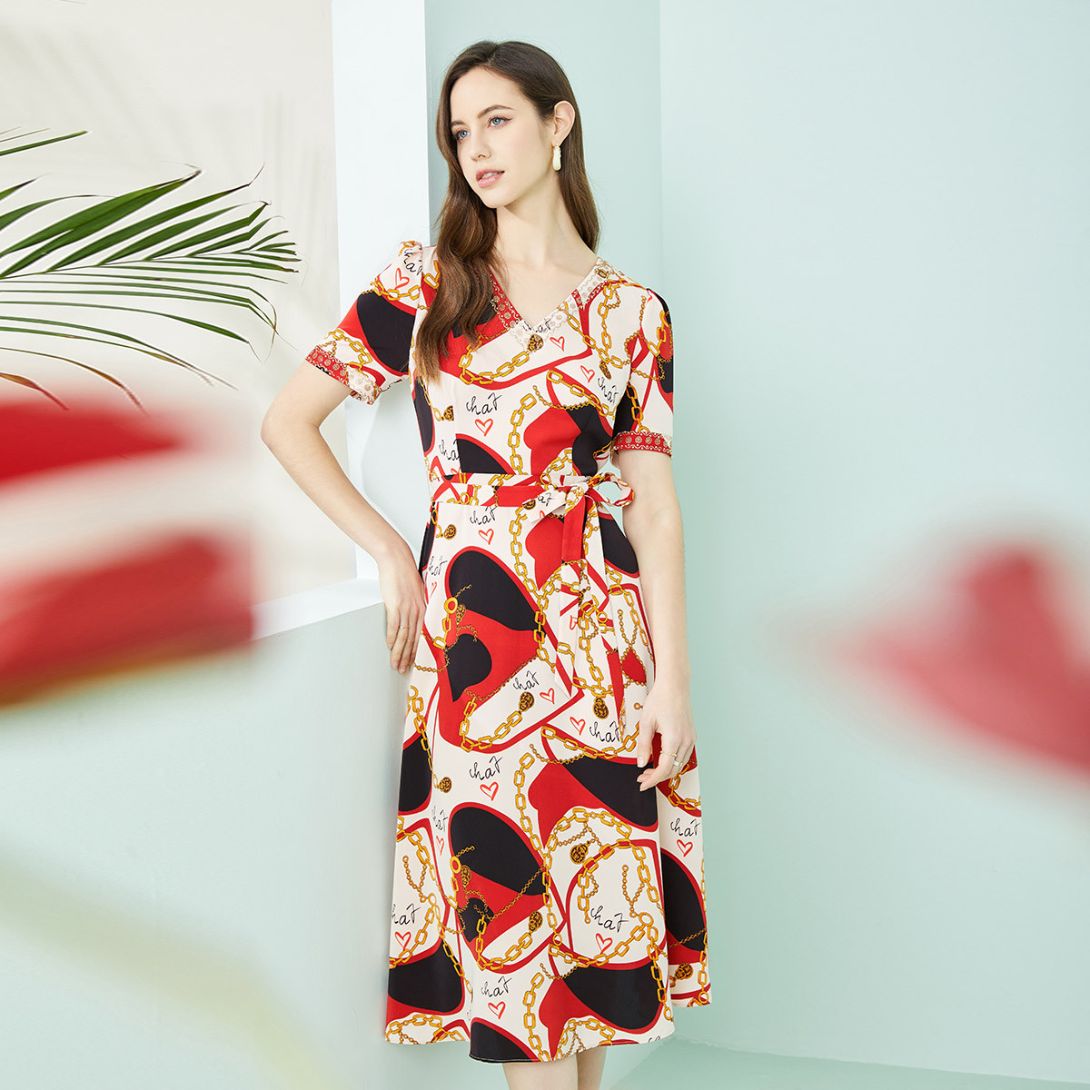 商场同款秋季名媛风优雅印花链条撞色v领烫钻收腰式连衣裙 015839