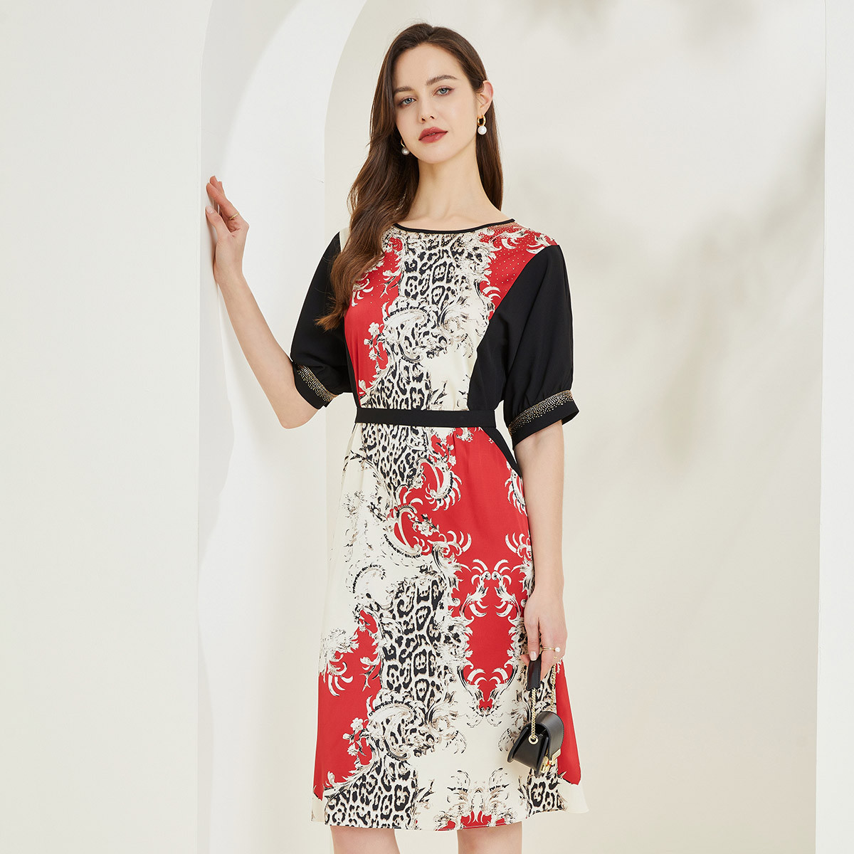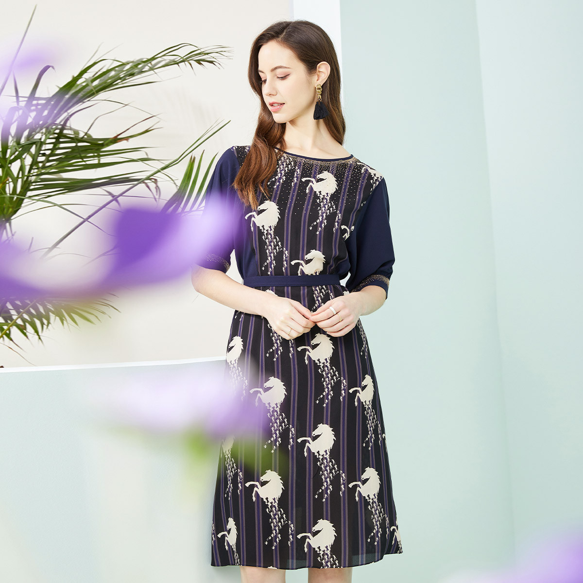 商场同款春季优雅飞马印花拼接袖烫钻圆领连衣裙 096351