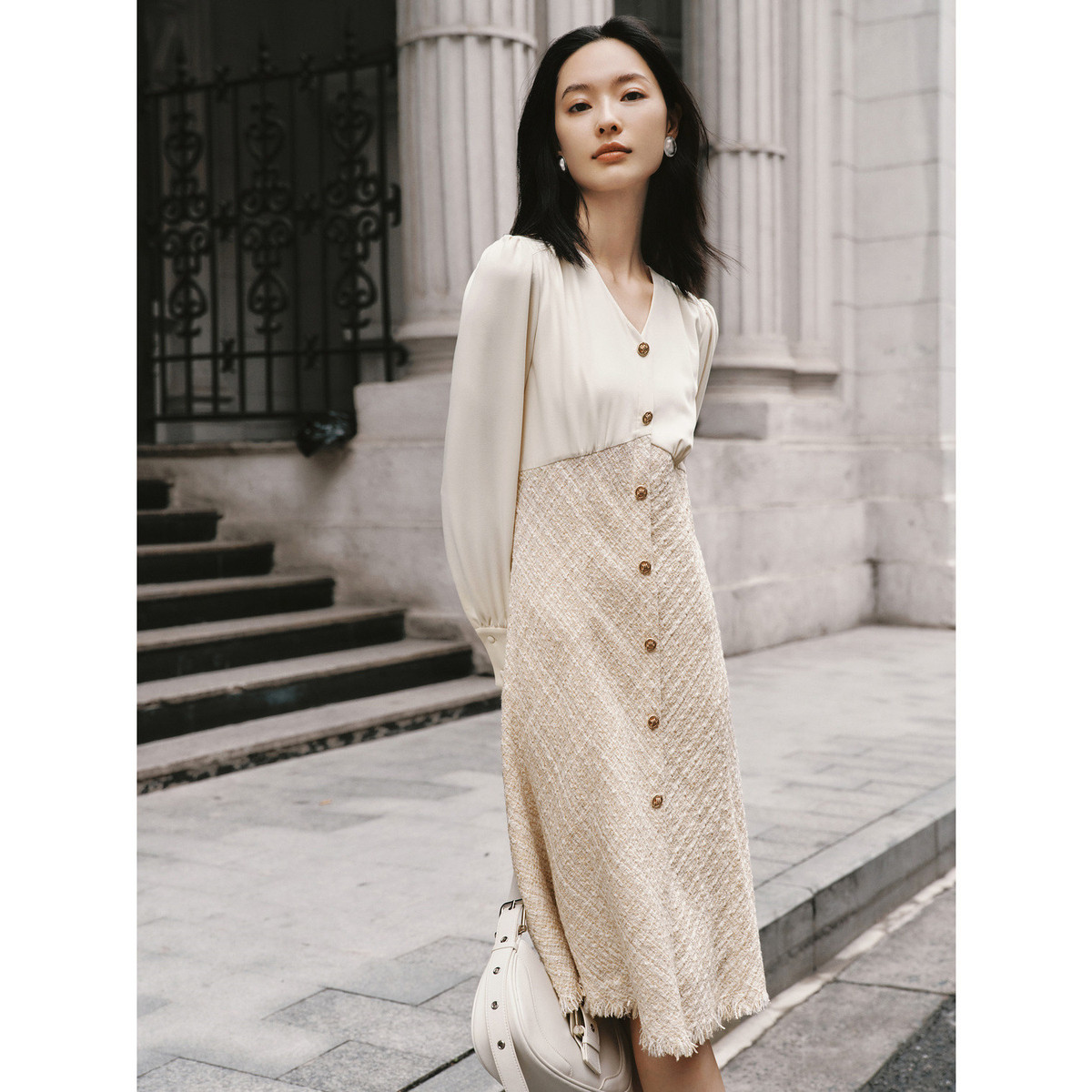 玖姿旗下安娜蔻系列V领气质花呢拼接长袖连衣裙女秋 744012
