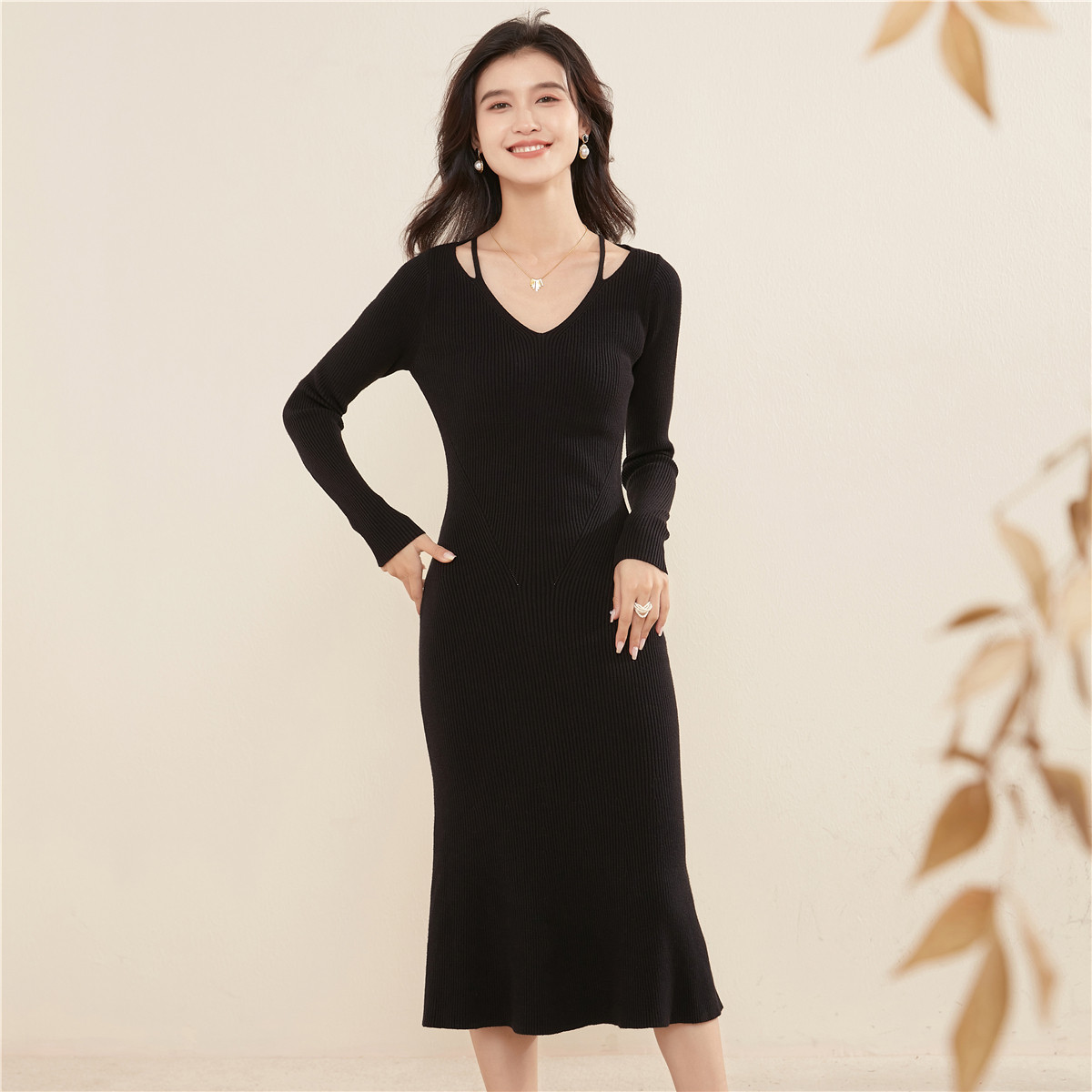 【配大衣】法式连衣裙修身气质V领打底毛衣裙女秋冬 331231