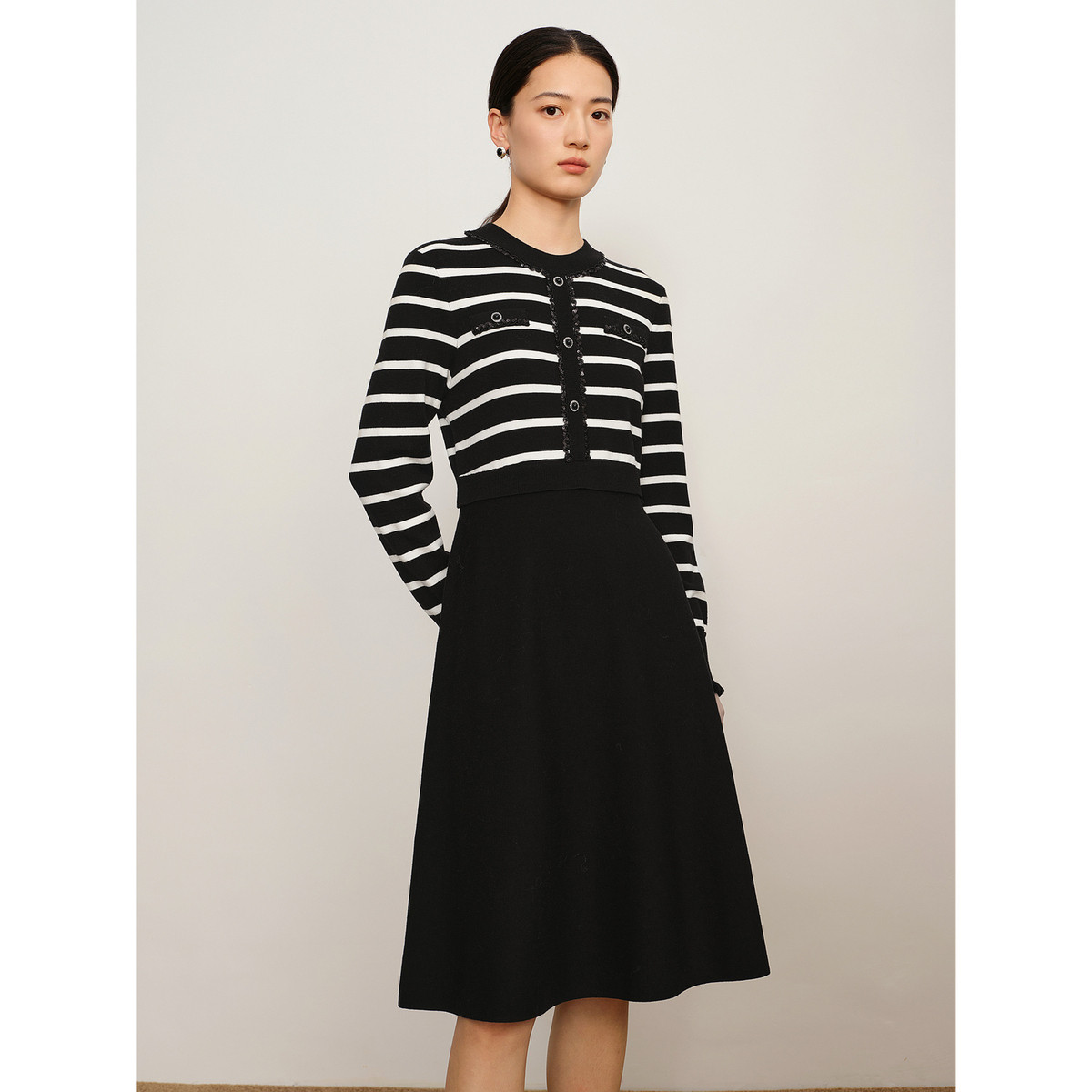 玖姿旗下安娜蔻系列优雅小香风条纹拼接圆领长袖连衣裙女冬季 206284