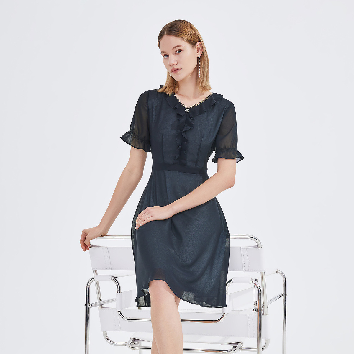 玖姿夏季气质V领飘逸雪纺优雅短袖连衣裙 394828