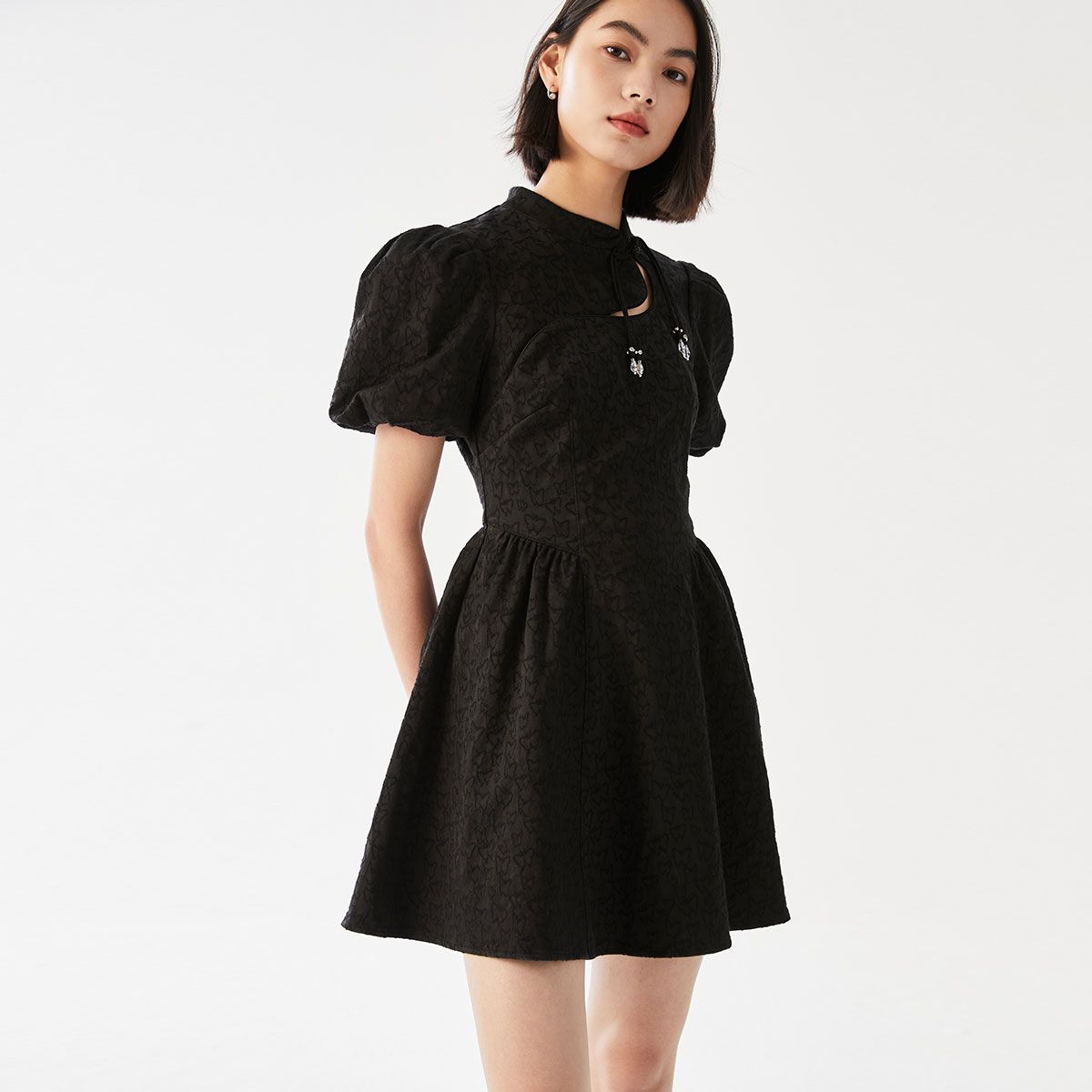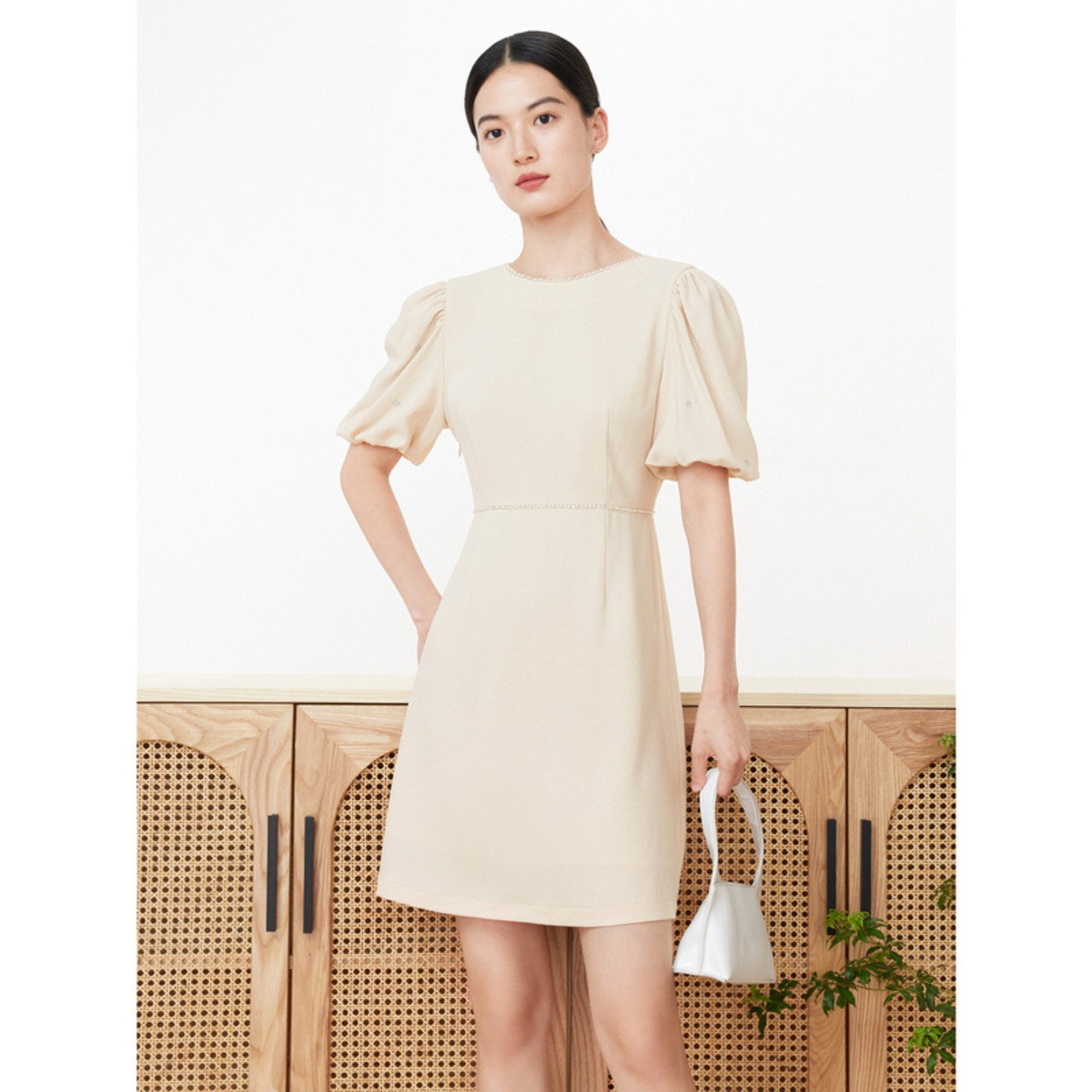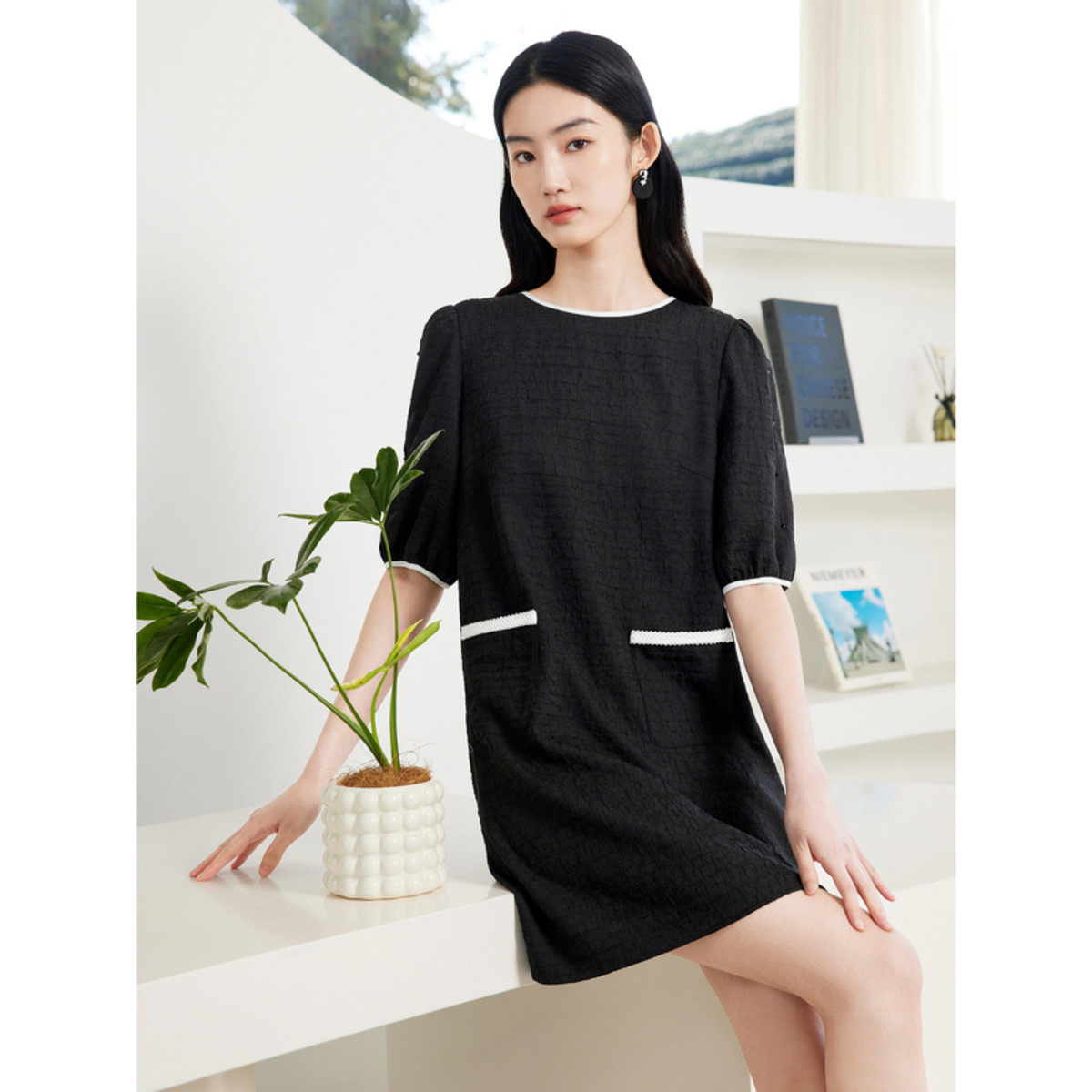 玖姿旗下安娜蔻系列肌理感直身连衣裙女装夏季法式泡泡袖镂空裙子 971340