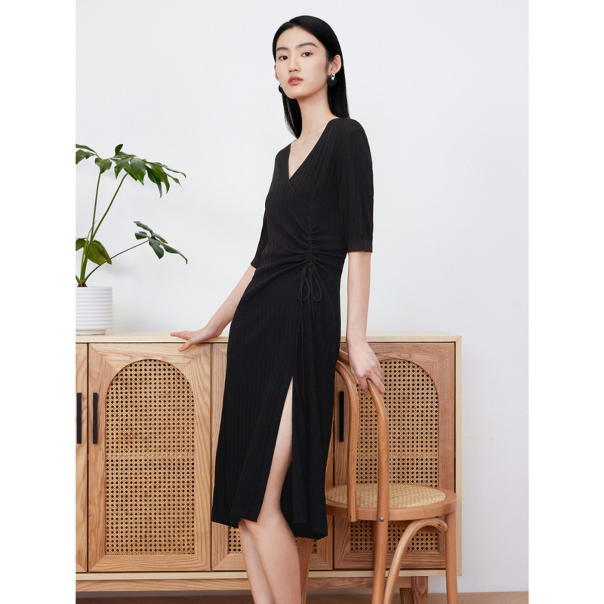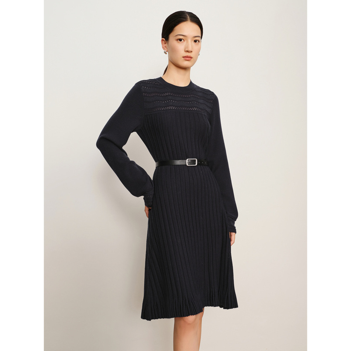 玖姿旗下安娜蔻系列优气质圆领镂空压褶毛衫连衣裙女冬季 330764