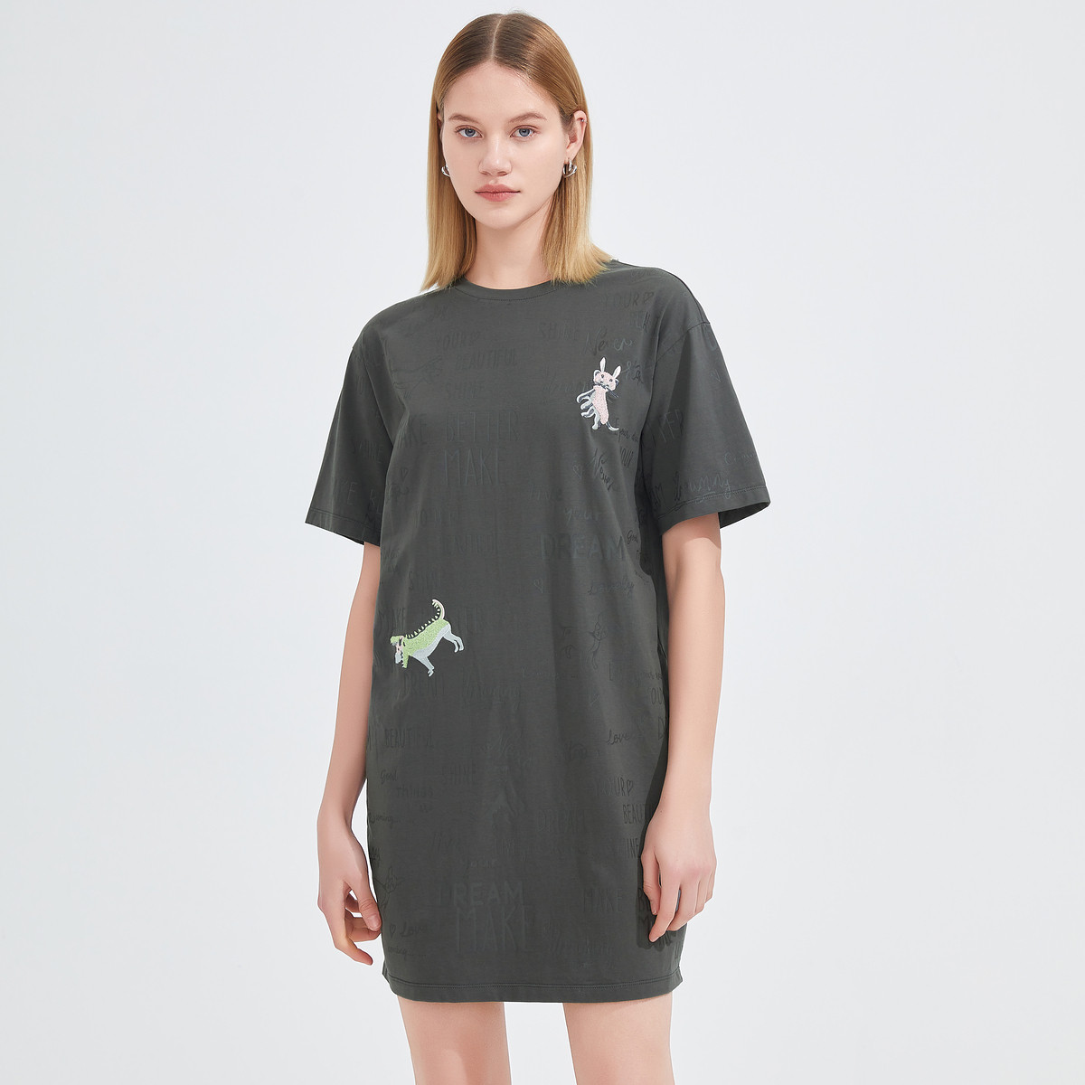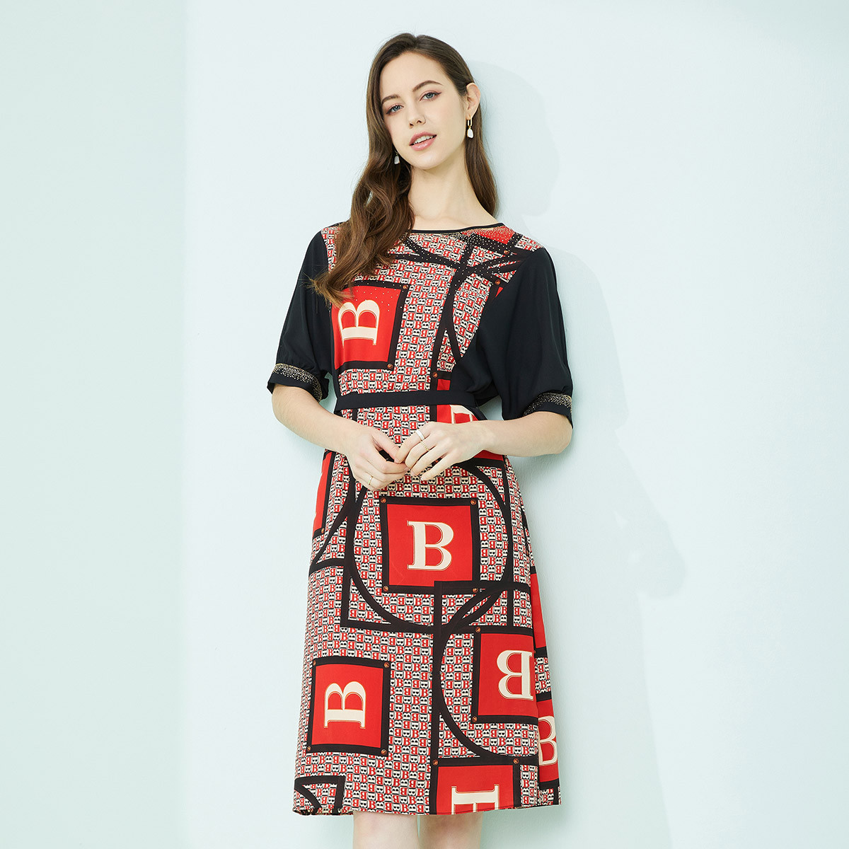 商场同款秋季气质高腰多元素字母印花圆领短袖连衣裙 279711