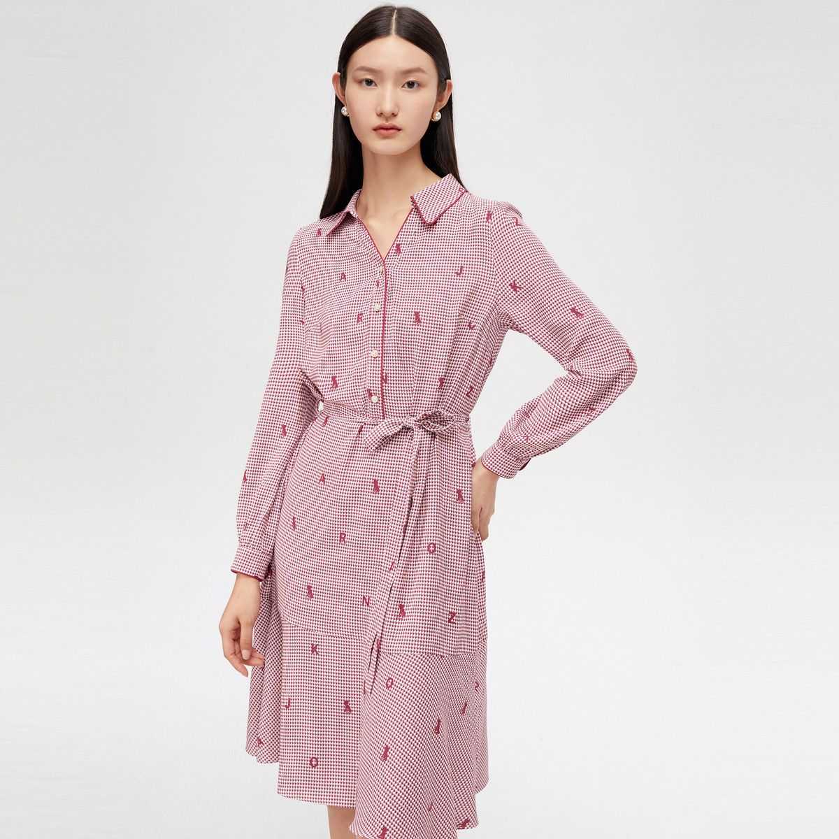 玖姿旗下安娜蔻系列春季红格纹趣味印花气质优雅女雪纺连衣裙 399948
