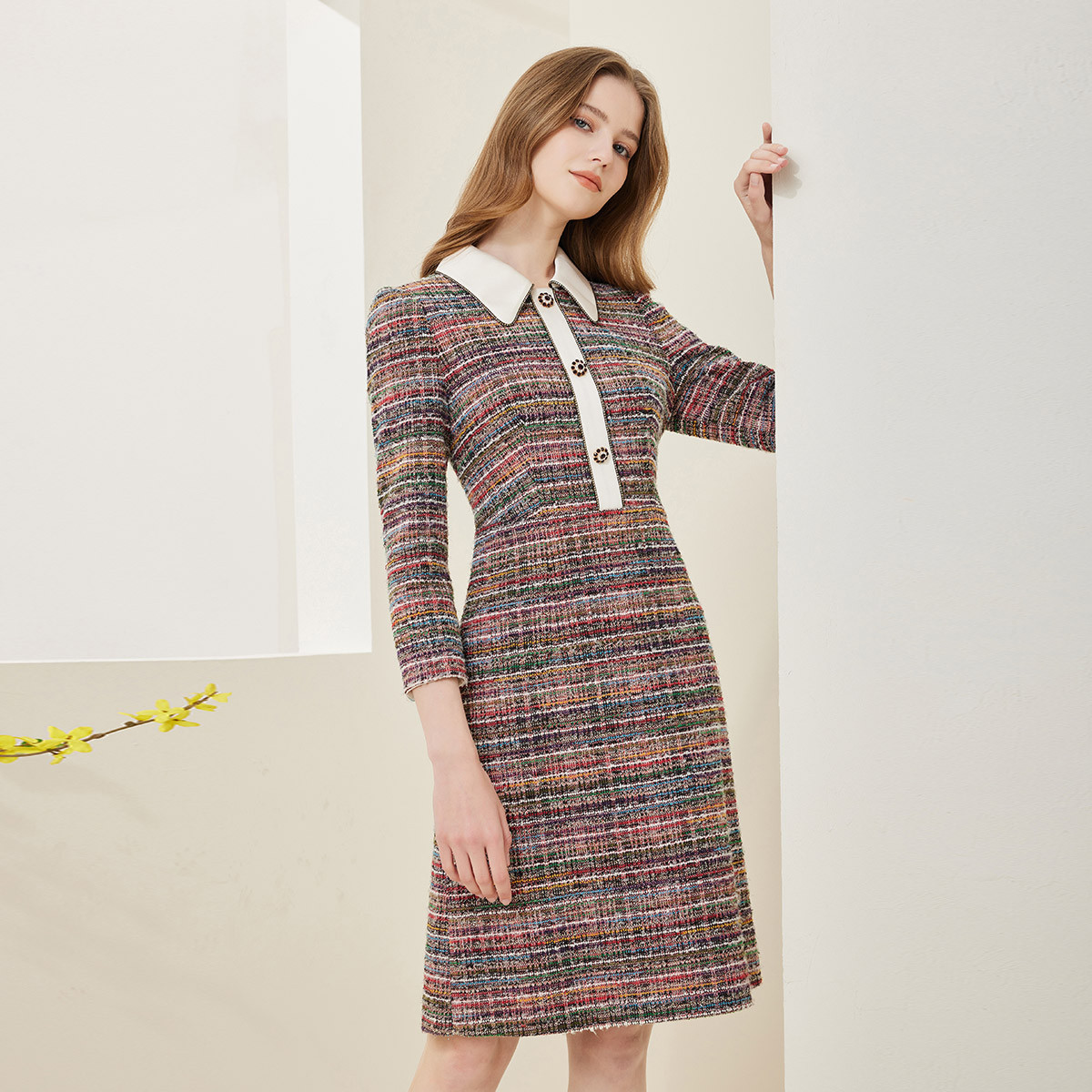 法式复古精致小翻领撞色格纹连衣裙 486303