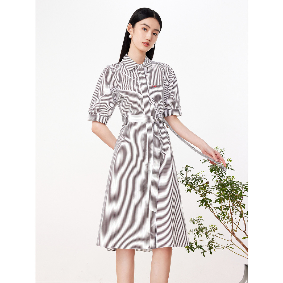 JZ玖姿文艺条纹女装夏季短袖刺绣字母衬衫连衣裙 996684